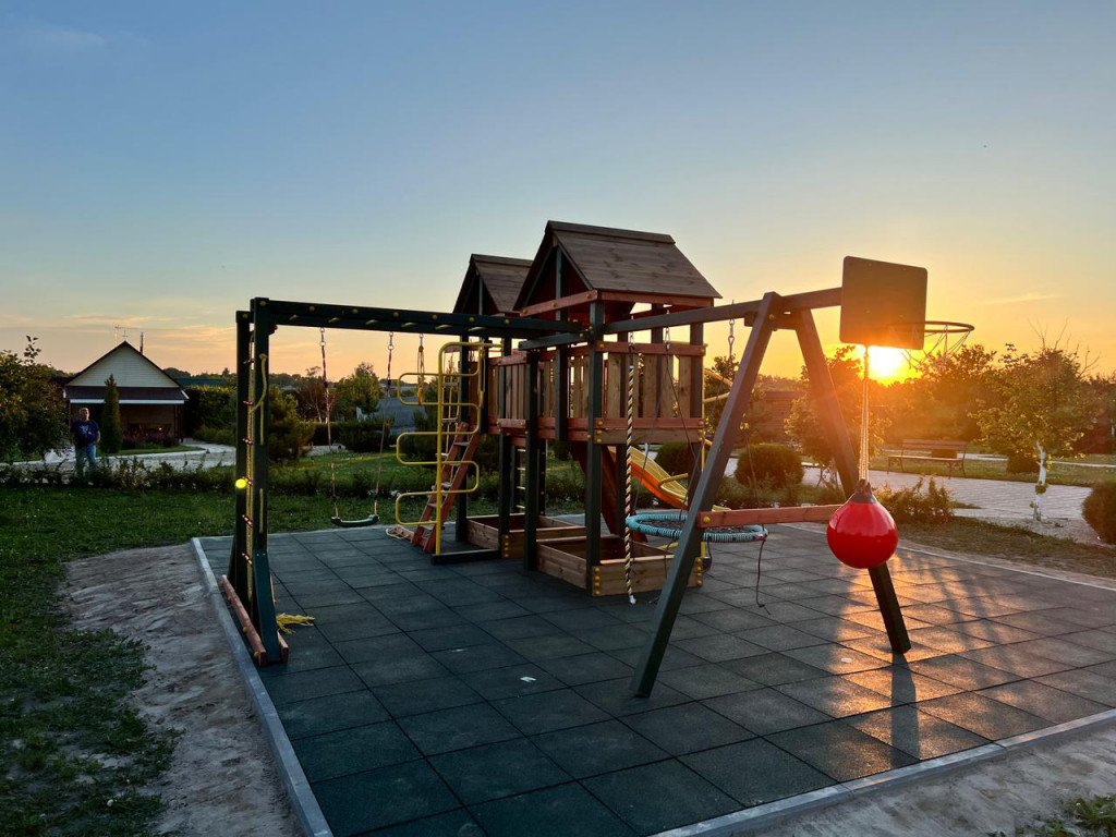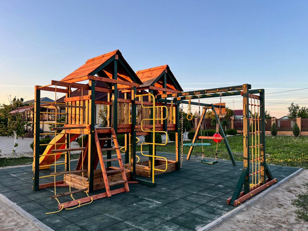 Мы доставили заказ в с. Дубовое. Наша бригада уложила основание, поставила игровой комплекс. Всё сделано качественно. Результаты — на фото.