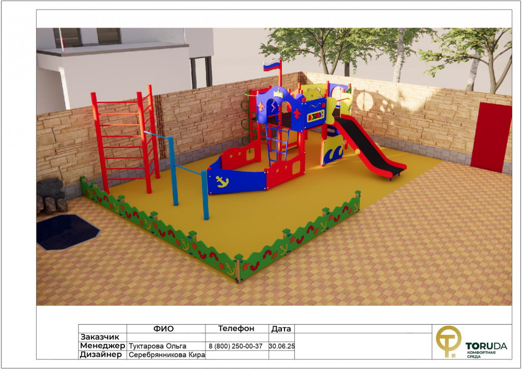 Заказ на благоустройство площадки для ребёнка 1,5 лет поступил от клиентки, решившей сделать подарок своей сестре. На территории частного коттеджа планировалось создать игровую зону, которая будет актуальна как сейчас, так и в будущем. Основой проекта стал яркий комплекс в виде корабля, дополненный спортивным оборудованием, песочницей и красочным забором. Все элементы выполнены в морской стилистике, что позволило органично вписать площадку в пространство возле декоративного пруда.