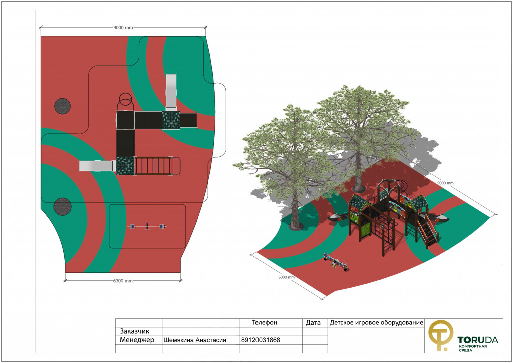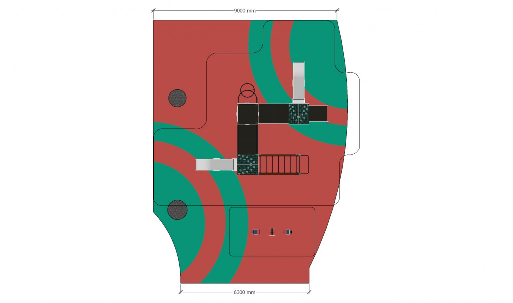 Для повышения безопасности детских игр площадка установлена на резиновое основание. Оно было заказано отдельно и уложено до монтажа комплекса. Перед началом работ сделана визуализация. Дизайнер показала, как вписать оборудование в имеющееся пространство и уложить покрытие с учётом растущих на территории деревьев.
