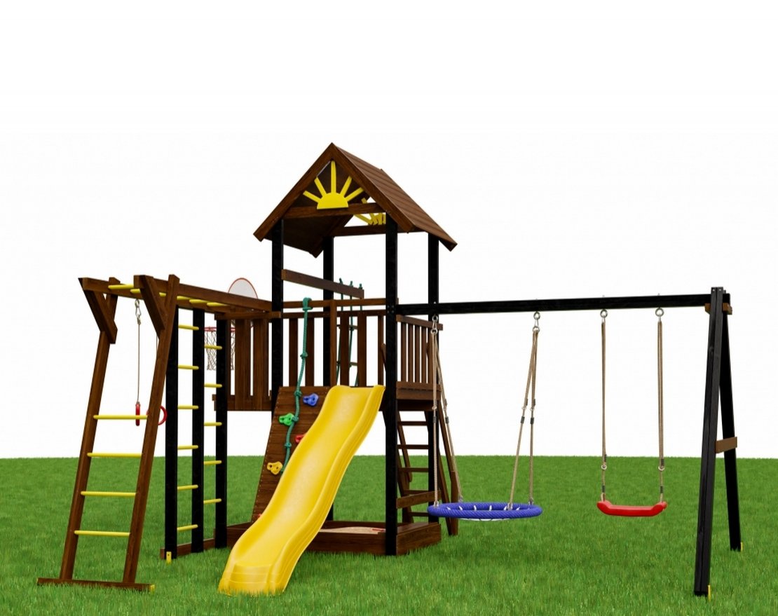 Кроме традиционных модулей, которые есть во всех площадках серии Флорида, конструкция дополнена рукоходом и гимнастическими кольцами, а это новые возможности для развития мышц спины и рук ребенка. Игры на качелях, горной стенке с канатом, игры с баскетбольным мячом позволят улучшить работу вестибулярного аппарата, укрепят мышцы ног и всего тела.