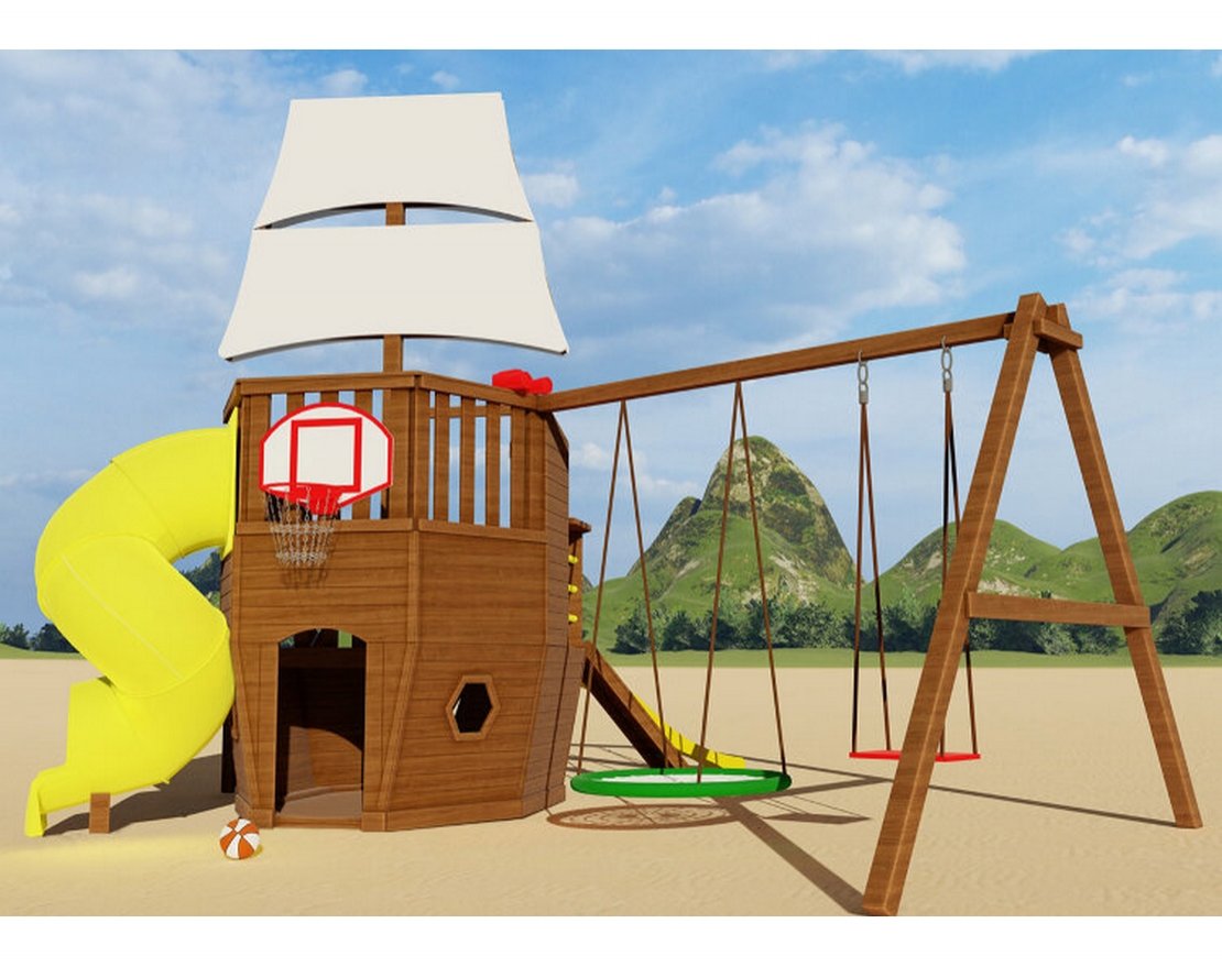 Каравелла 2 - большой игровой корабль с мачтой и парусом. Изготовлен из карельской сосны первого сорта и тщательно отшлифован. Тщательная обработка и покраска методом окунания каждой детали в краску, обеспечивает износостойкость и долговечность игрового центра. Использованная краска Galamix безопасна, не токсична и не вызывает аллергии. Все детали корабля изготовлены в соответствии с техникой безопасности и гарантирует комфортные, не травмирующие игры. Большой центр предназначен для общественного пользования. Двухуровневая игровая башня имеет безопасную лестницу с перилами, канатную стенку, скалолазку и две горки. Баскетбольное кольцо позволит детям среднего возраста поиграть на площадке в мяч, а руль на втором ярусе заинтересует самых маленьких детей. Детская площадка имеет также качельную балку, с двумя качелями. Два вида качелей подойдут под любую возрастную категорию детей до 16 лет.