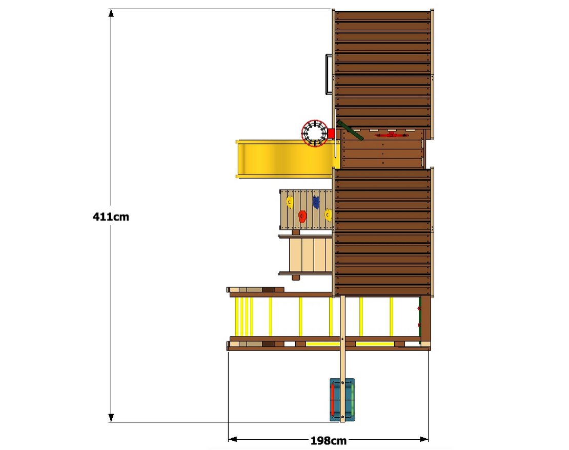 Дизайнеры продумали все детали до мелочей – безопасная устойчивая конструкция, надежные крепления, защитные перила на лестнице и на маршевой площадке, наличие козырька, под которым удобно прятаться в непогоду или от палящего солнца. Еще один важный плюс – это экологичность, комплекс сделан из натурального дерева.