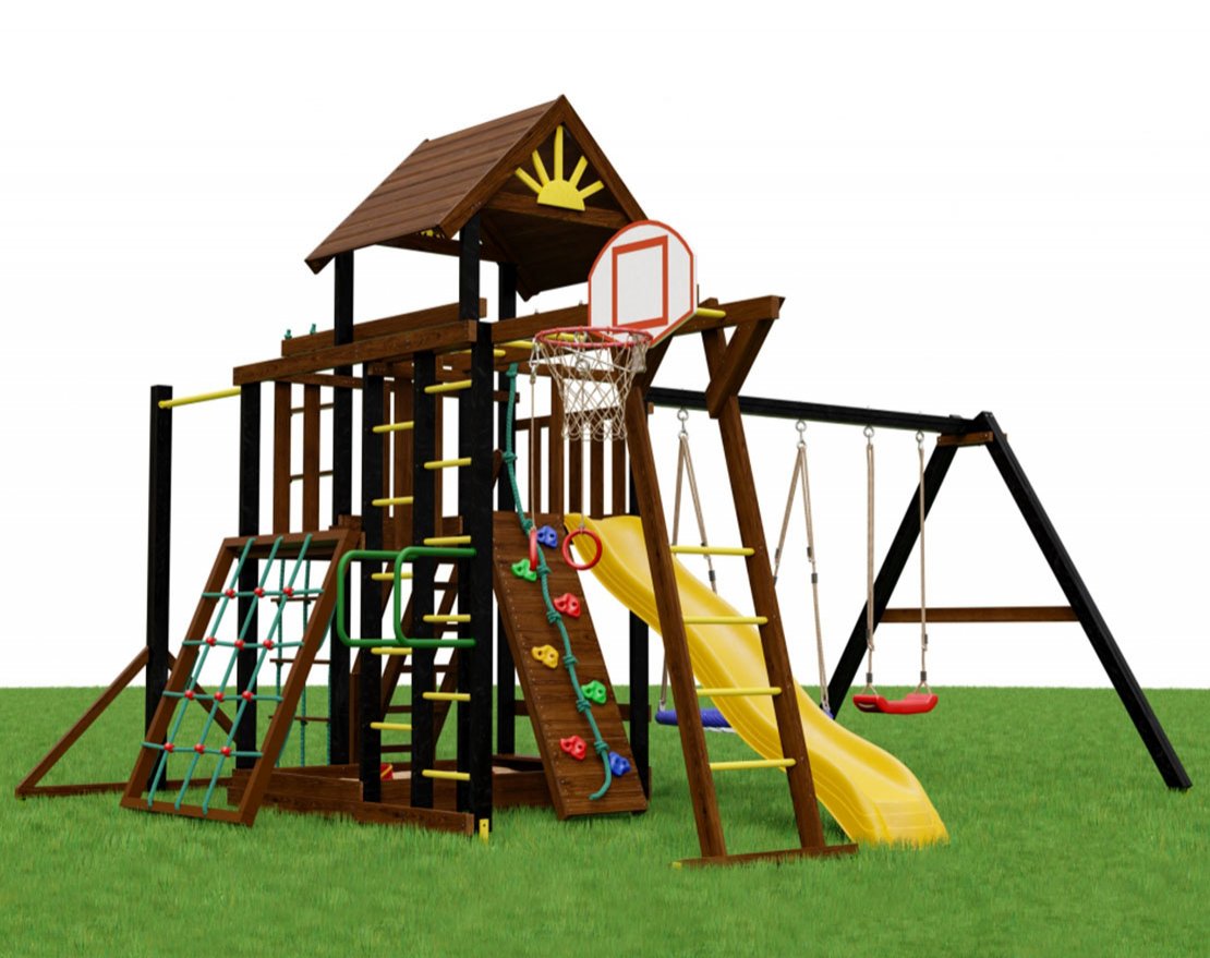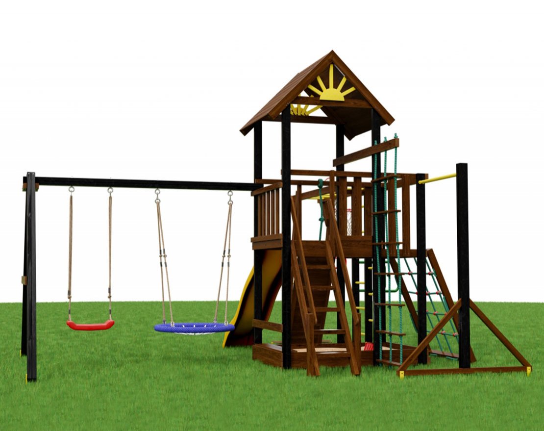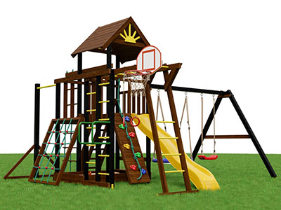 Площадка сочетает в себе спортивные модули, которые интересны детям любого возраста: шведскую стенку, качели, веревочную лестницу, горную стенку, гимнастические кольца, рукоход, брусья, сетку для лазания. Игры и занятия на них укрепят все мышцы, повысят аппетит, улучшат координацию, сделают более ловким.