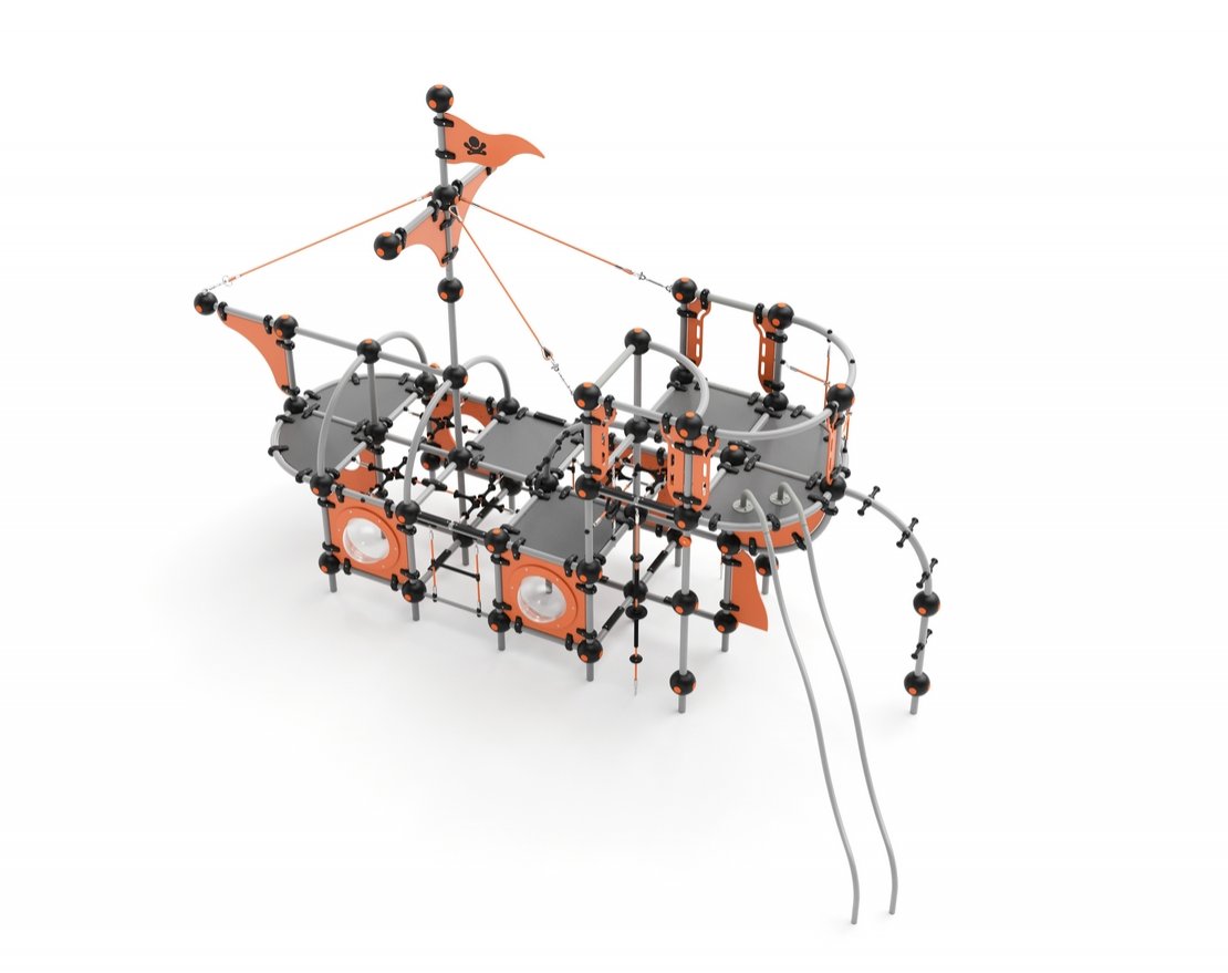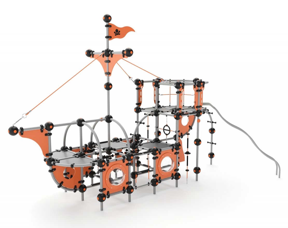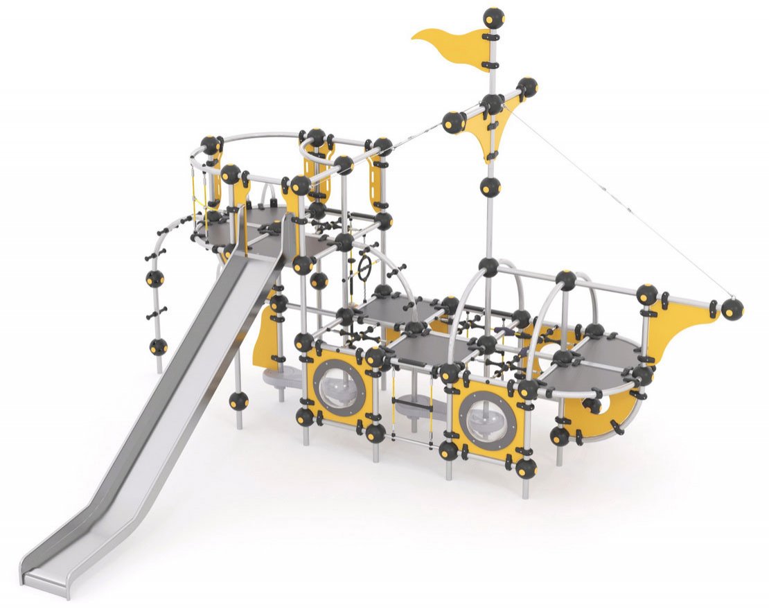 Комплекс выполнен в виде корабля. Представляет собой игровое пространство, состоящее из металлического каркаса, пластиковых панелей, металлической горки с защитными бортиками, панелей с иллюминаторами.