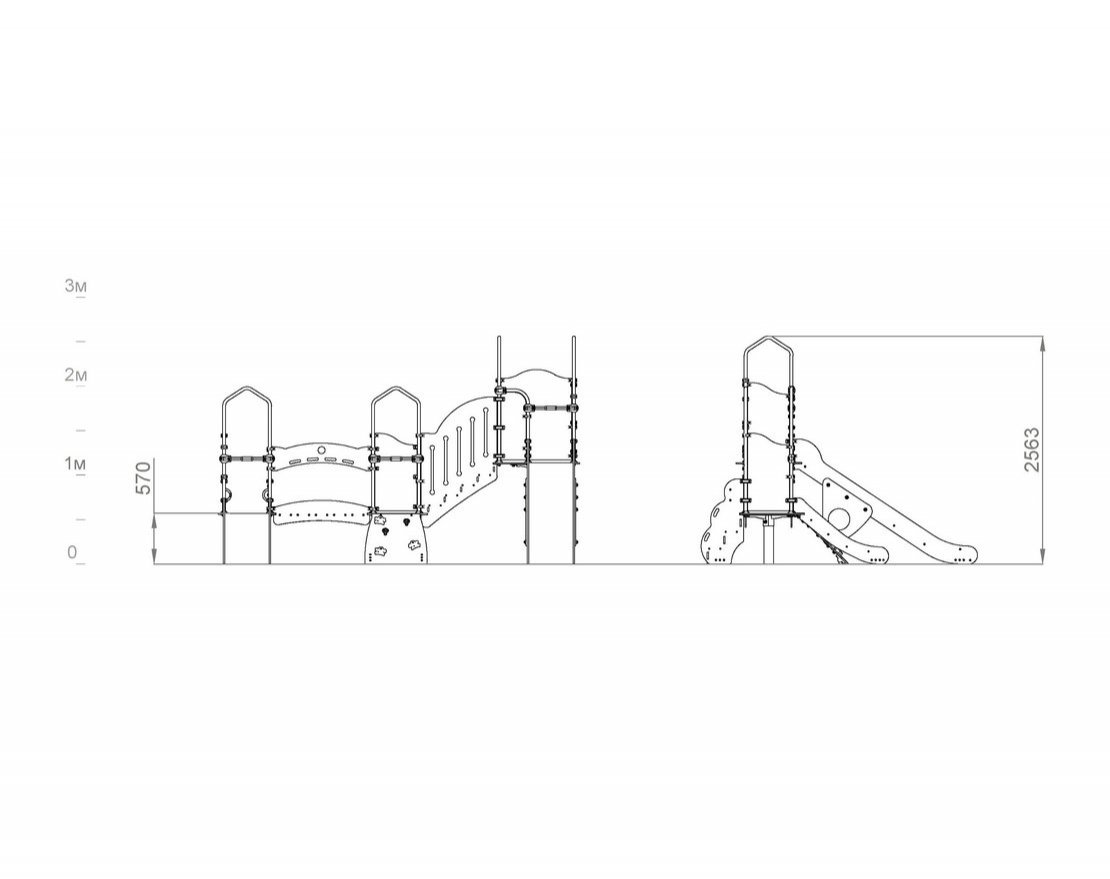 Состоит из металлических горок с защитными бортиками, малой скалодромной панели с зацепами. Для большей безопасности, поверхность ступеней и мостика — антискользящая. Все крепежные элементы закрыты защитными колпачками и заглушками.