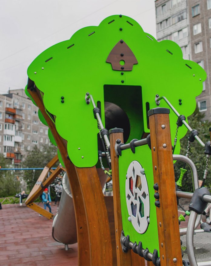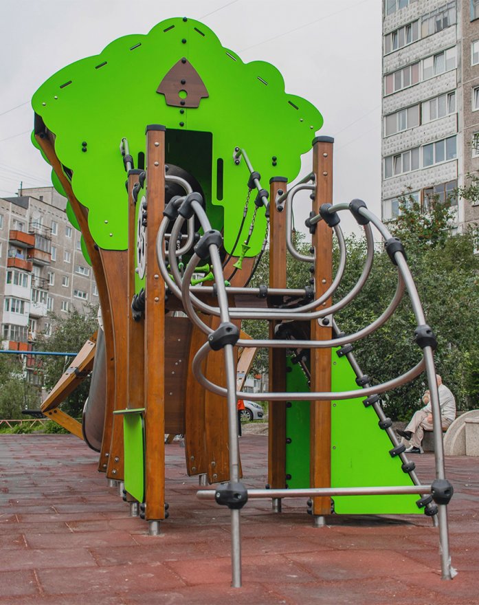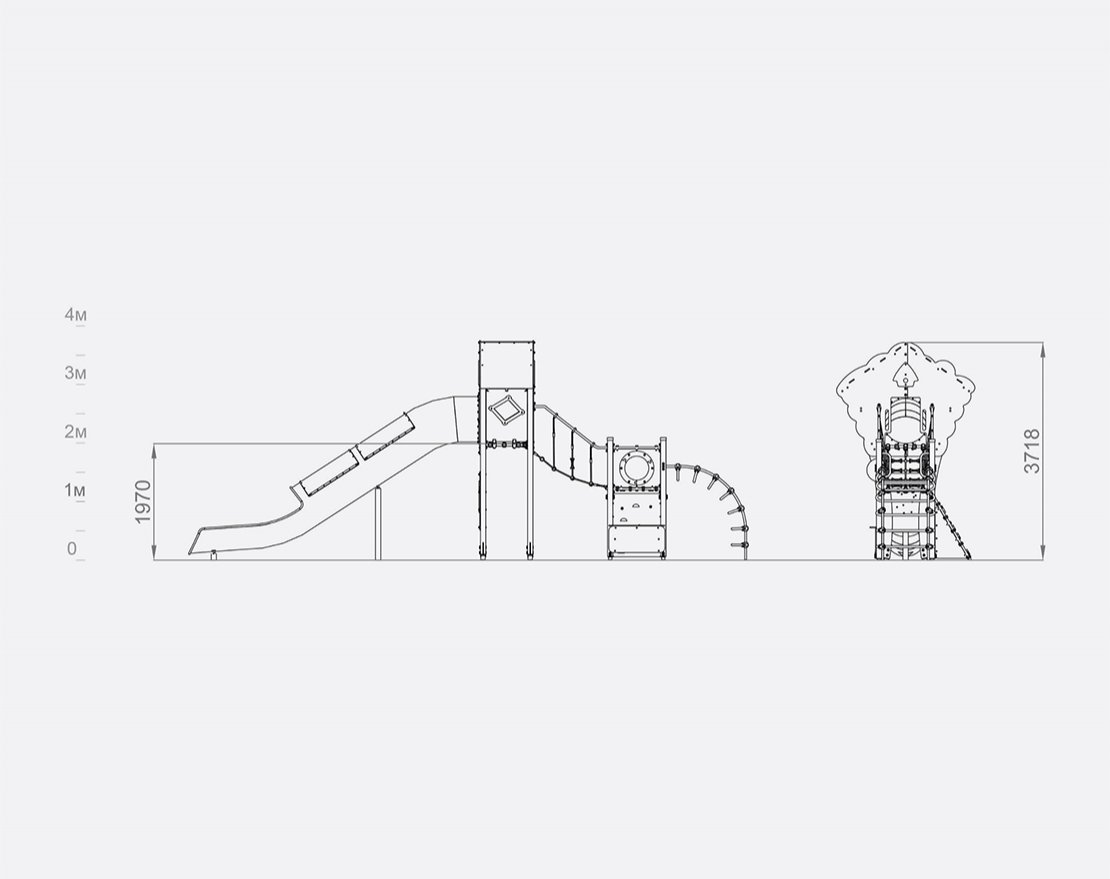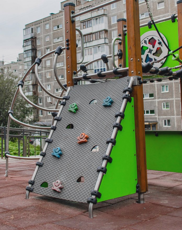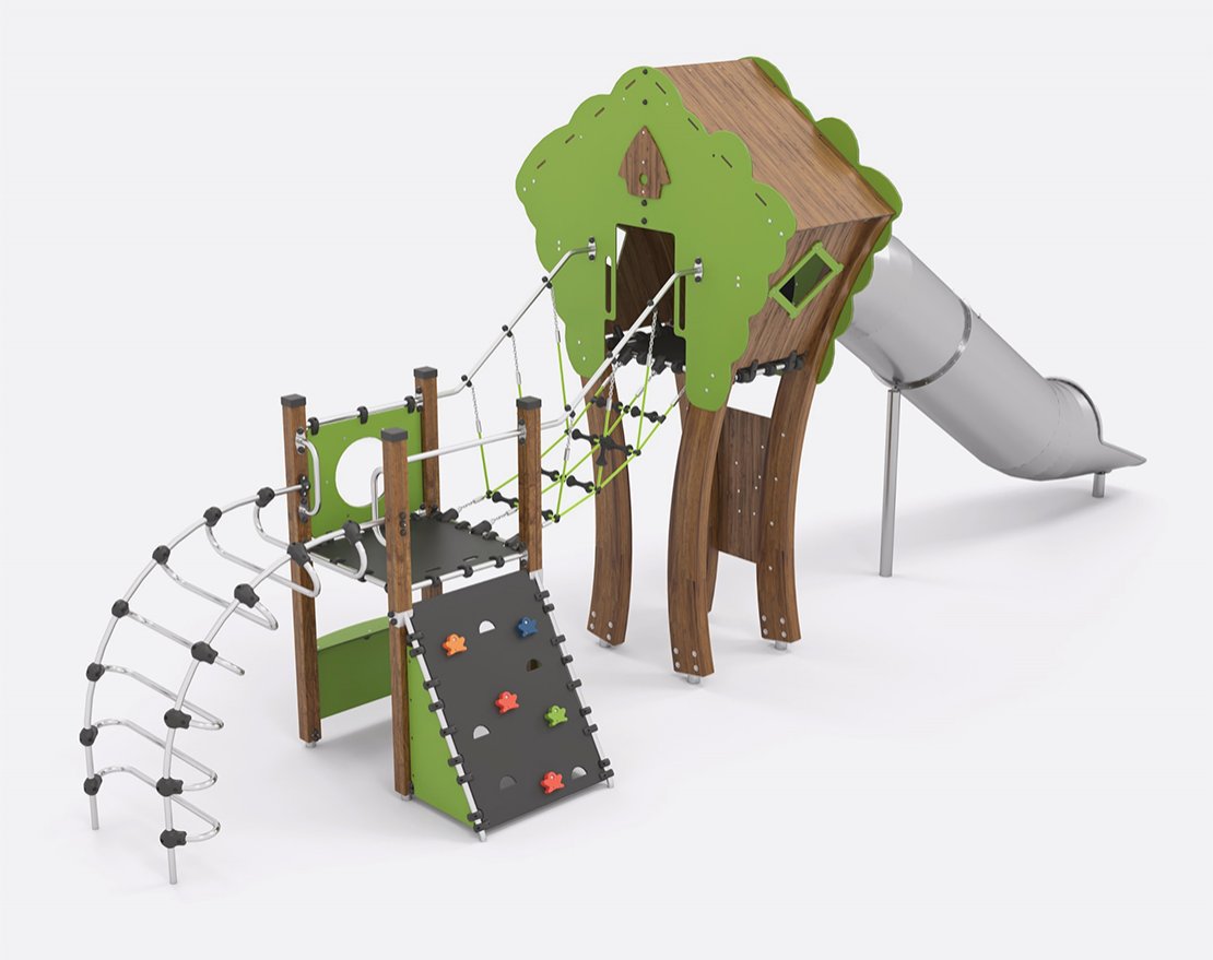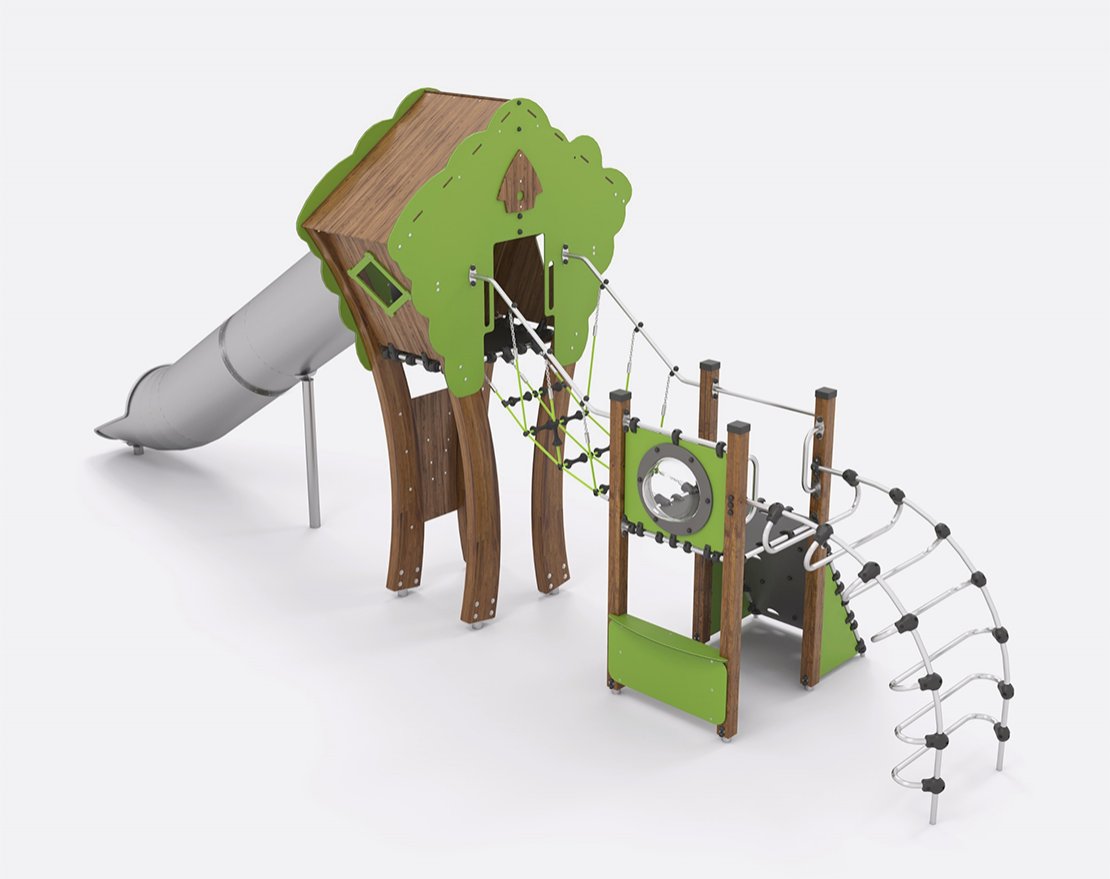 Состоит из металлических опорных стоек, канатной сетки, пластиковых панелей и закрытой тоннельной горки. Комплекс также оснащен панелью со скалодромными зацепами.