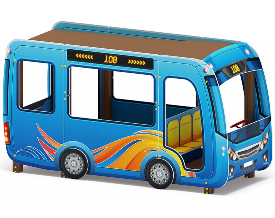 Состоит из 6-ти деревянных стоек из клееного бруса 100х100, объединённых в единую конструкцию бортами, стилизованными под салон автобуса. Борта имеют различные габариты, в бортах – дверь и окна, в салоне имеется пол (на отм 0,300 от планировочной отм земли) и крыша из ламинированной антискользящей фанеры толщиной 18 мм, размерами 1000х2210. Салон оснащён лавочками из влагостойкой фанеры различной длины, шириной 230 мм. Вход оснащён ступенью из ламинированной антискользящей фанеры толщиной 18 мм.