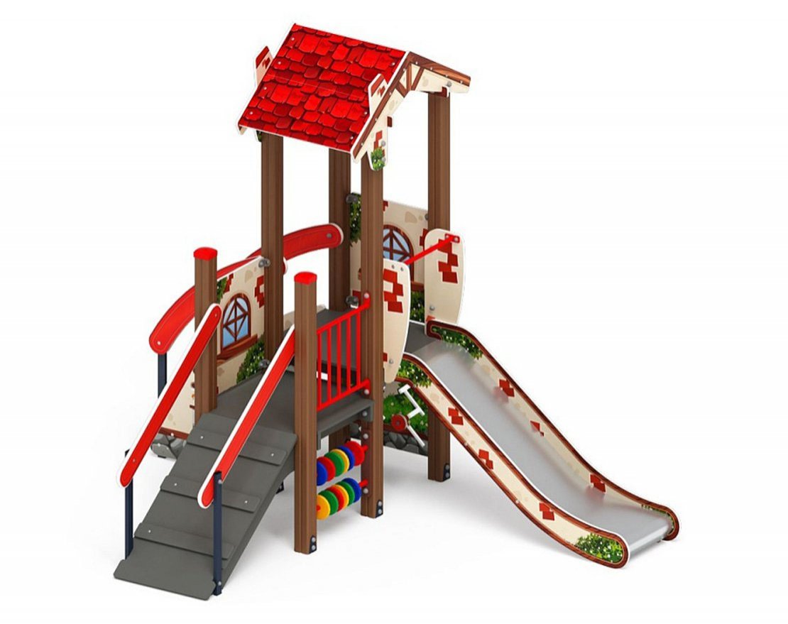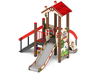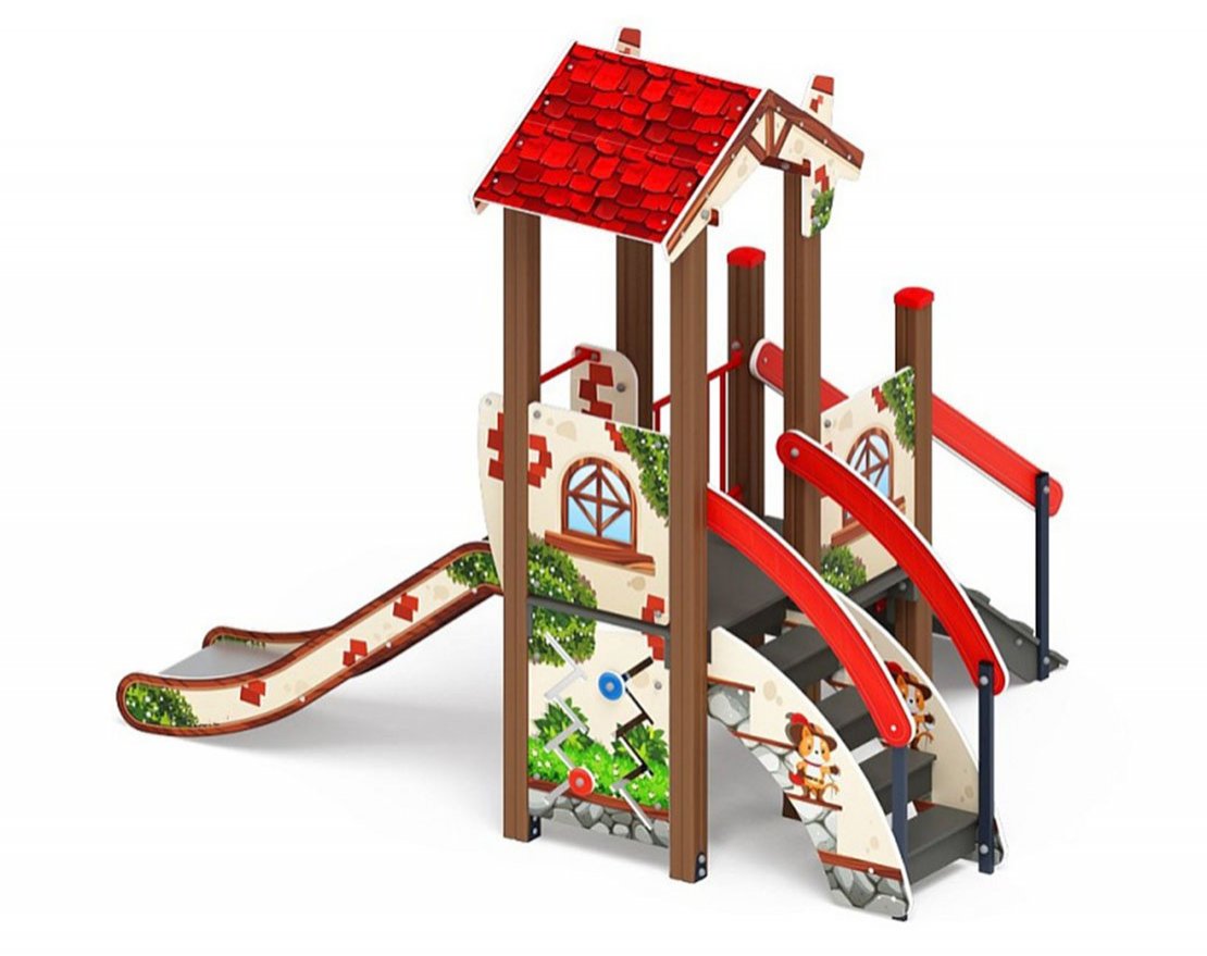 Спаренные башни из шести клеёных брусьев 100х100мм высота 2500мм (4 шт) и 1500мм (2 шт); полы из ламинированной фанеры, с анти-скользящим покрытием 780х780мм толщиной 18мм (2 шт). Одна часть башни украшена двускатной крышей из влагостойкой фанеры - арки из фанеры толщиной 18 мм, скаты крыши фанера толщиной 12 мм. Кромки фанеры тщательно отшлифованы, фанера окрашена с нанесением принта. Башня двухуровневая - от планировочной отметки площадки 900 мм и 750 мм соответственно. Габарит башни 780х1460х2790мм