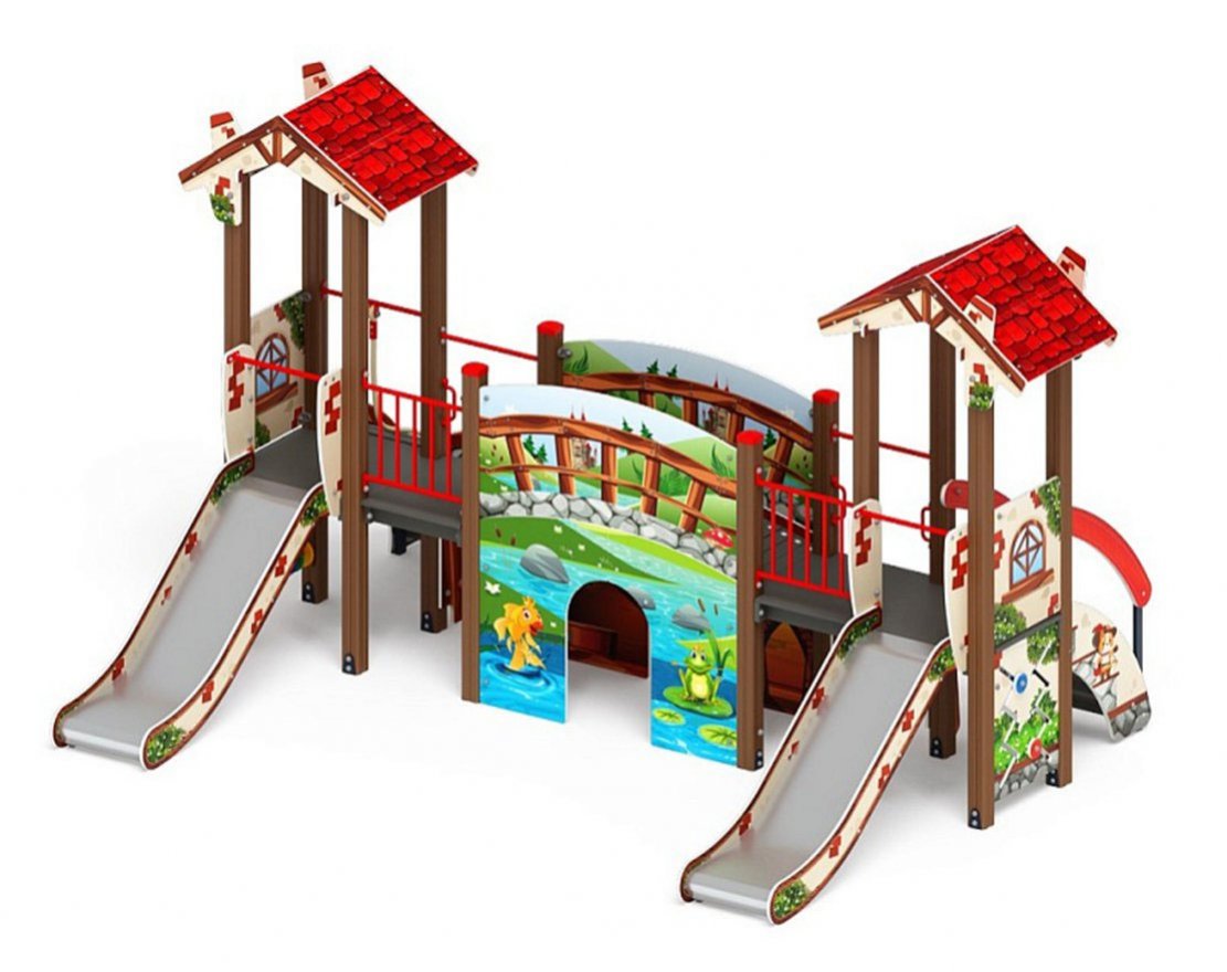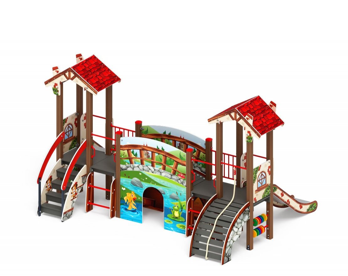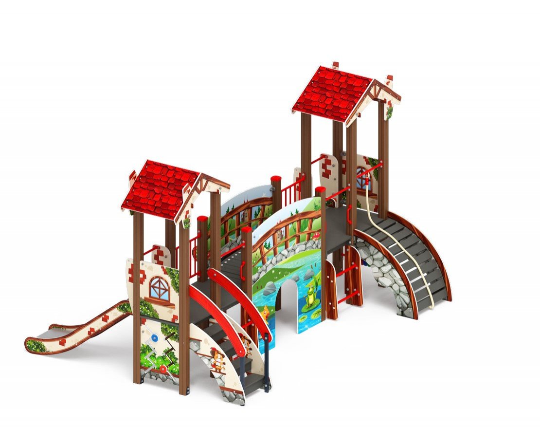 Под дугообразным мостом расположен домик. Домик выполнен из щитов из влагостойкой фанеры толщиной 18 мм размерами 750х1080 мм и накладок 500х250 мм (в комплекте 4 щита и 2 накладки). Кромки фанеры тщательно отшлифованы, фанера окрашена с нанесением принта.