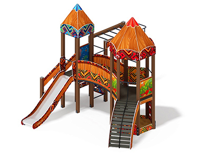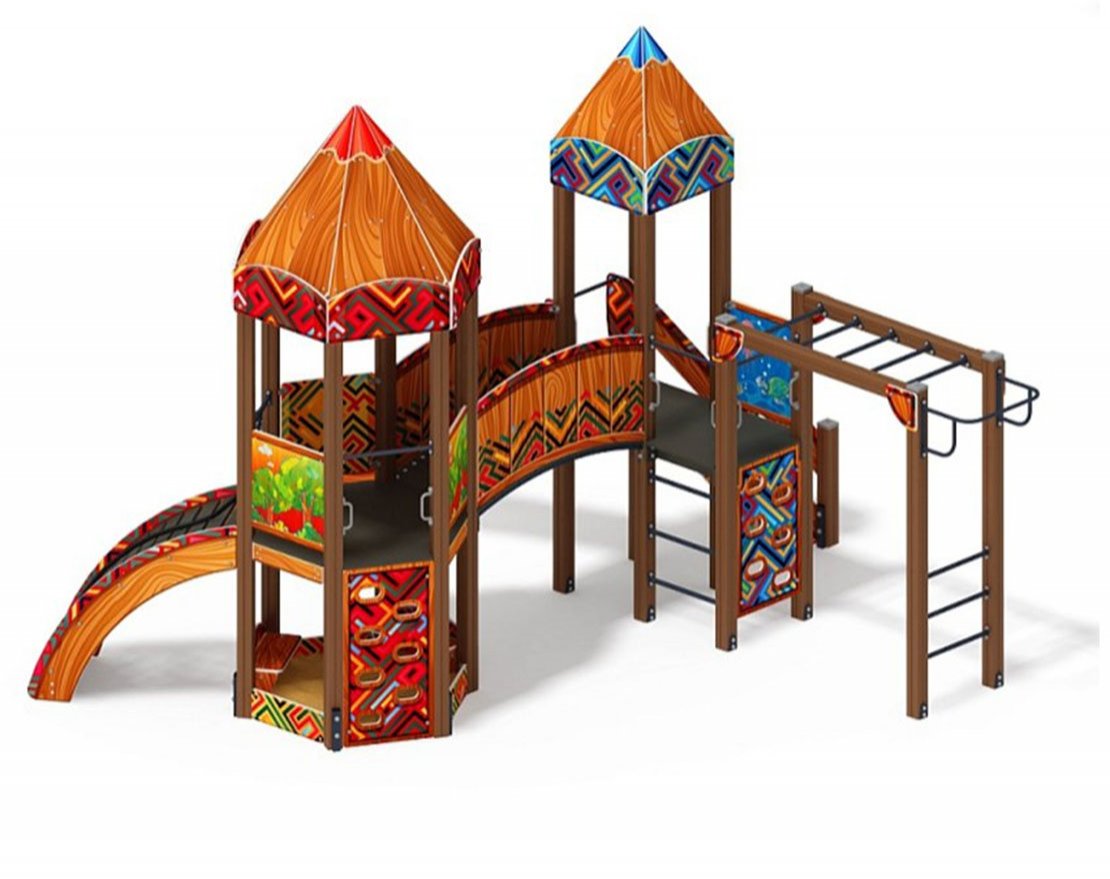 Спаренная башня из шести клеёных брусьев 100х100 мм высота 3000 мм-4 шт и 2200 мм- 2 шт; полы из ламинированной фанеры, с анти-скользящим покрытием 1460х780мм толщиной 18мм. Башня состоит из двух частей, над частью с горкой имеется четырёхскатная крыша из фанеры толщиной 12 мм, кромки фанеры тщательно шлифованы, фанера окрашена с нанесением принта. Башня украшена стилизованными декоративными арками (780х380х18мм) и четырехскатной крышей, крыша поставляется в сборе и выполнена из влагостойкой фанеры толщиной 12 мм (габариты в сборе 770х770х740мм), кромки фанеры тщательно шлифованы, окрашены с нанесением принта. Отметка пола башни от планировочной отметки площадки 1200. Высота башни 3740 мм.