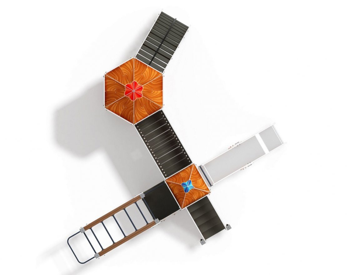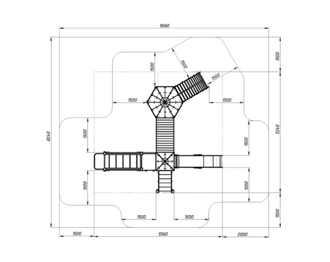 Шестигранная башня выполнена из шести клеёных брусьев 100х100 мм высота бруса 3000 мм; пол из ламинированной фанеры, с антискользящим покрытием мм толщиной 18 мм по лагам из ламинированной и влагостойкой фанеры. Над башней имеется шести- скатная крыша из фанеры толщиной 12 мм, кромки фанеры тщательно шлифованы, фанера окрашена с нанесением принта. Крыша поставляется в сборе. Внешний периметр крыши закрыт декоративными арками из влагостойкой фанеры толщиной 18 мм, габарит арки-780х380 мм. Отметка пола башни от планировочной отметки площадки 1200мм. Высота башни 3970 мм.