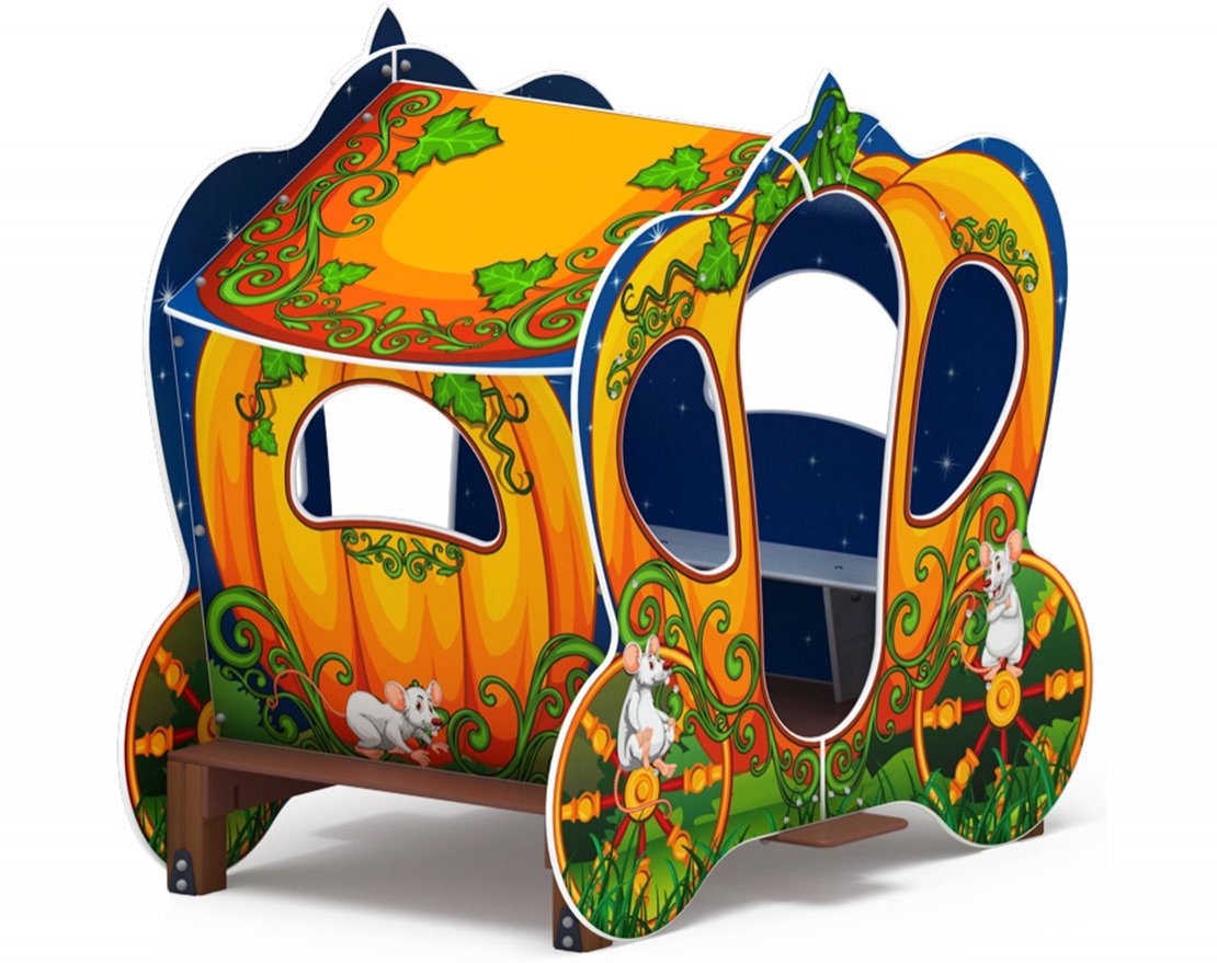 - Выполнена в виде сборной конструкции, которая состоит из бортов, стилизованных под карету. Борта выполнены из влагостойкой фанеры толщиной 18 мм. Борта имеют различные габариты, в бортах - дверь и окна, в салоне имеется пол (на отм .0,35 м от планировочной отм. земли) и крыша из фанеры толщиной 9 мм, салон оснащен лавочкой из влагостойкой фанеры( размеры 1200х300 мм). С обеих сторон вход оснащен ступенями из ламинированной антискользящей фанеры толщиной 18 мм. Вся конструкция опирается на 4 столба, выполненных из клееного бруса не более 100х100 мм, которым крепятся лаги из влагостойкой фанеры толщиной 24 мм