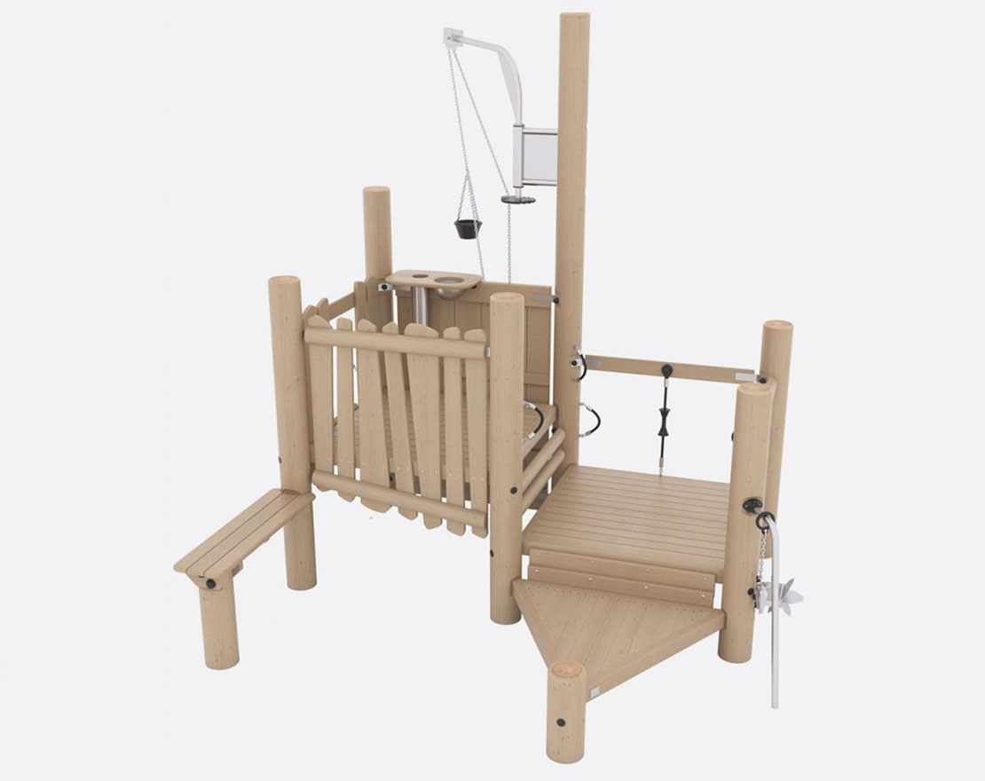 Состоит из опорных стоек, платформ и панелей, предназначенных для игр с водой и песком. Панель оснащена металлическими ковшами, чашами, резиновыми ведрами и мельницами для песка. Для большего комфорта, в конструкции установлены ручки-стропы и уступы.