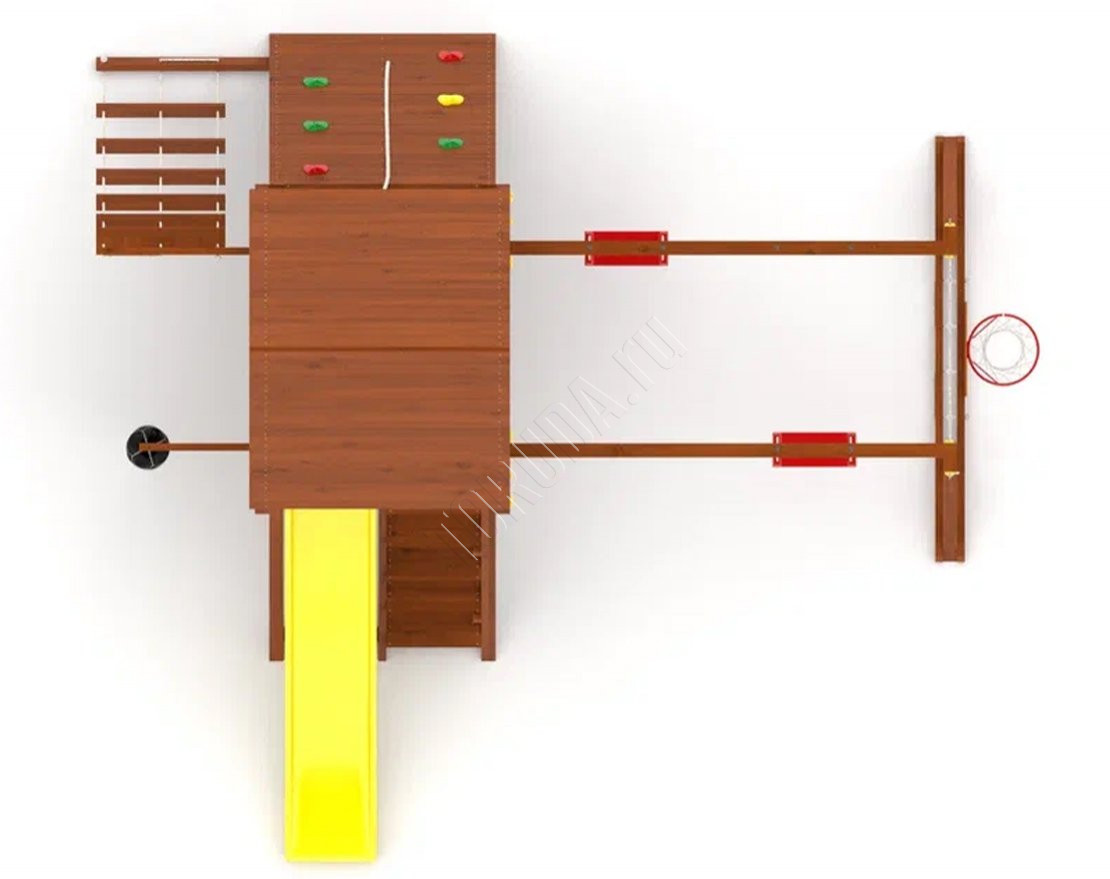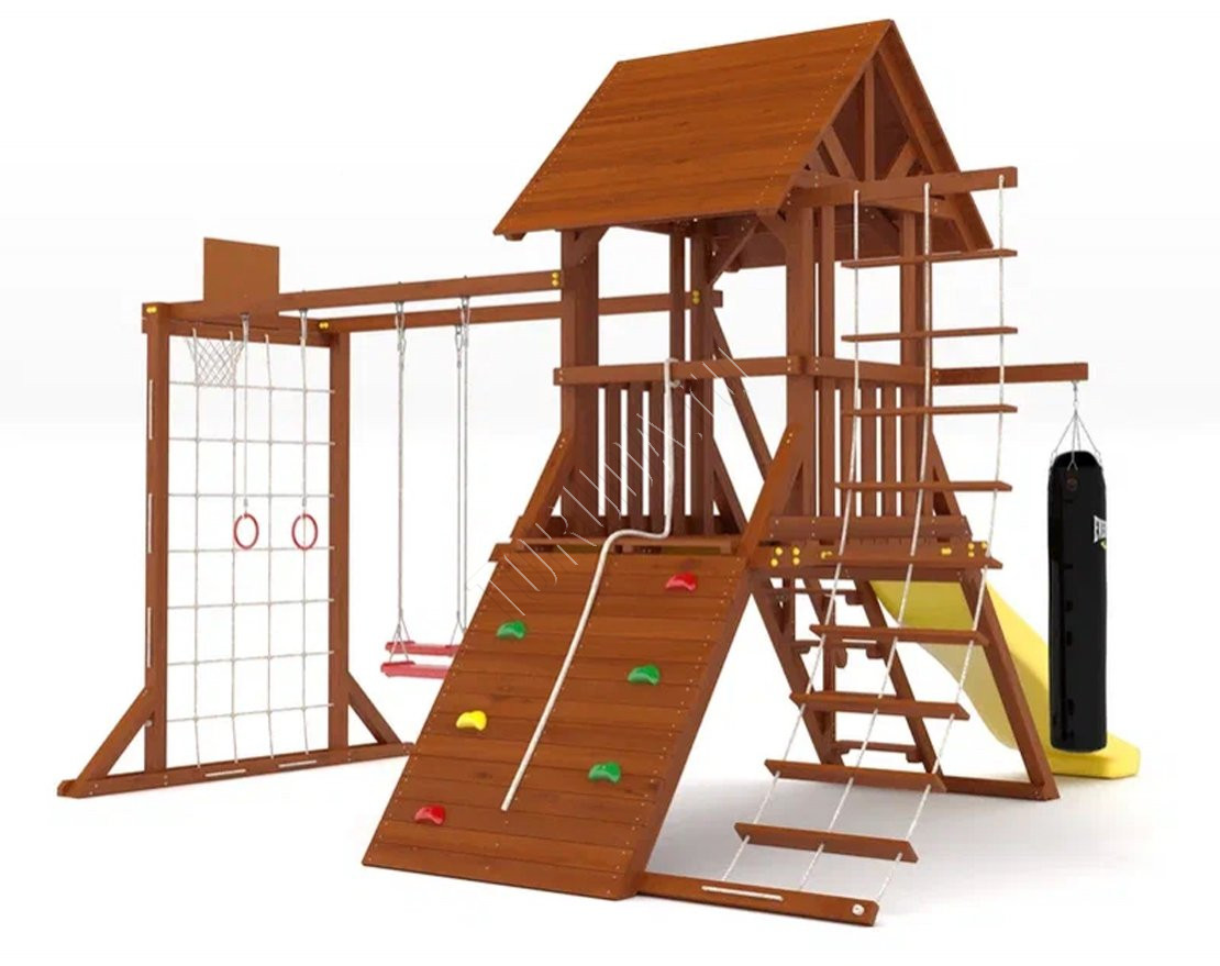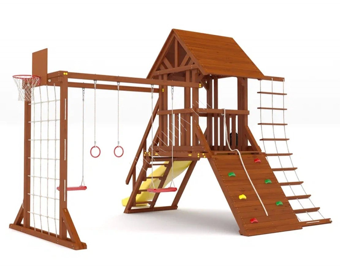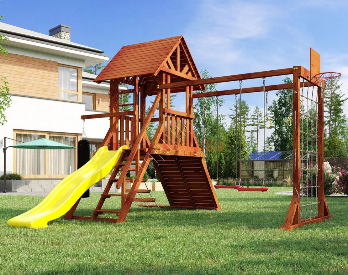Продуманное игровое пространство, которое сочетает активные развлечения и спортивные элементы. Подходит для детей разного возраста и станет отличным решением для дачного участка или загородного дома.