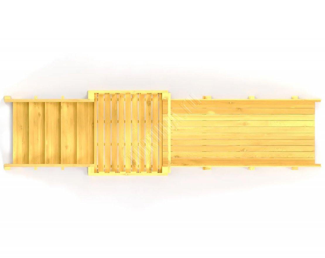 Для защиты малышей все деревянные детали площадки тщательно отшлифованы, а углы имеют скругленную форму. Элементы крепления закрыты несъемными заглушками.