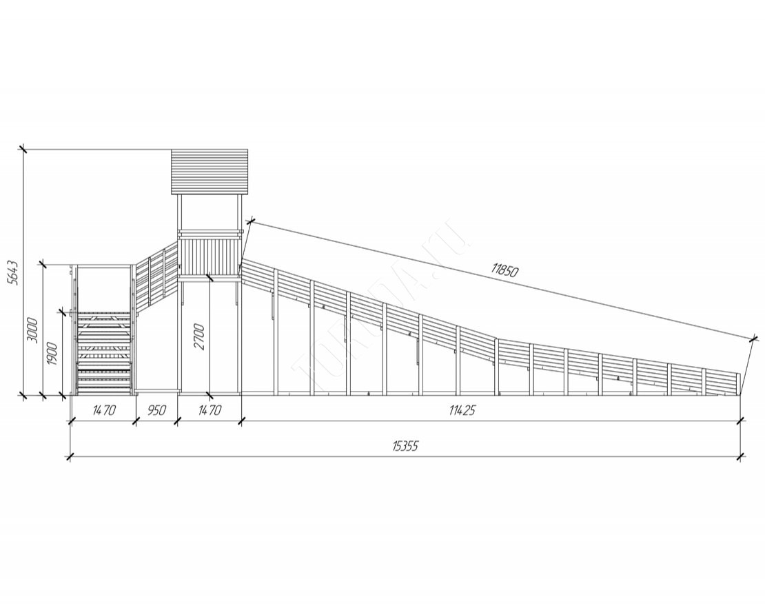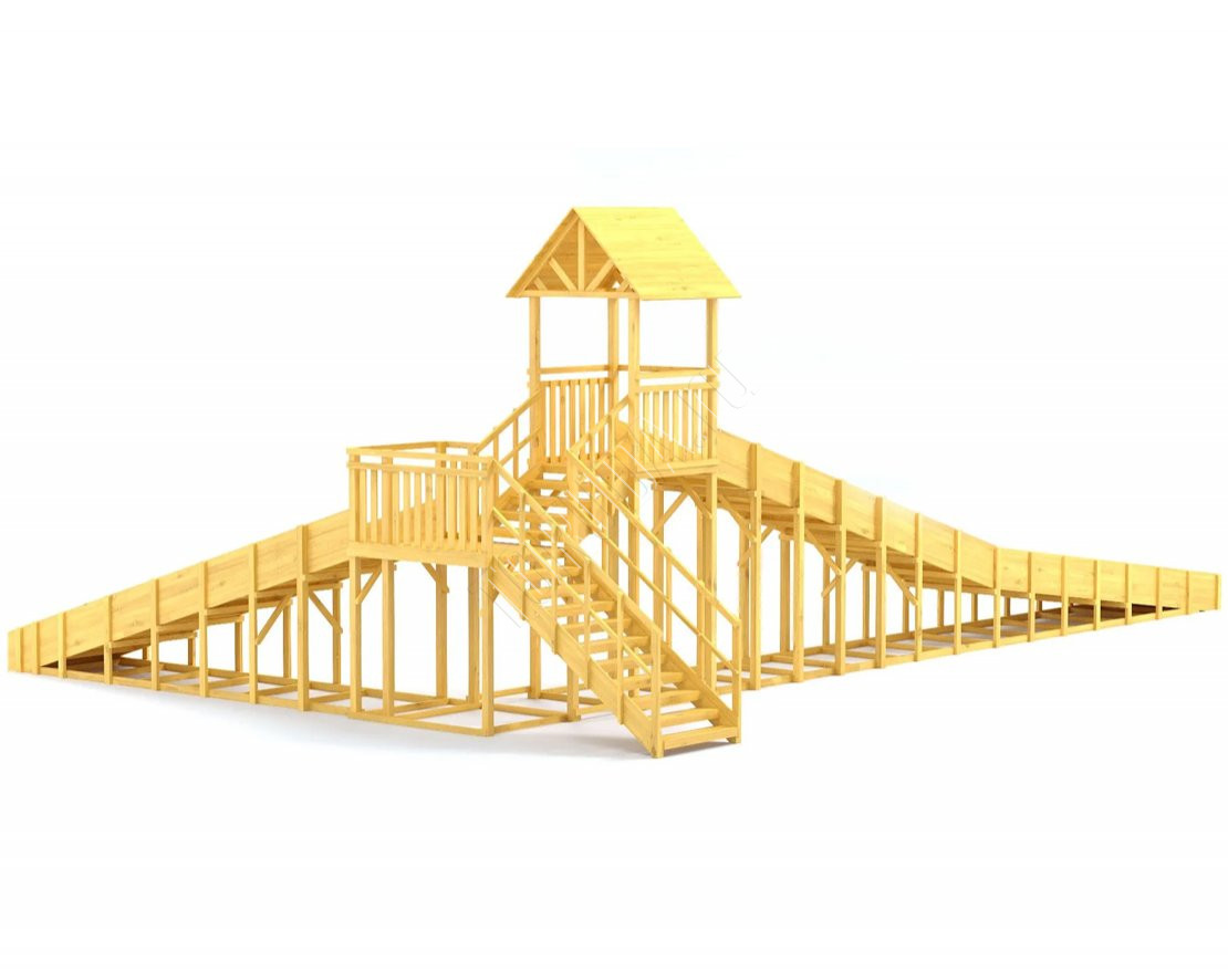 Прочный каркас из клеёного бруса камерной сушки выдерживает серьёзные нагрузки, все крепления закрыты заглушками, углы скруглены, а ступени сделаны с антискользящим эффектом (ребристые). Крытая верхняя платформа защищает детей от снега и делает игры комфортнее в любую погоду.