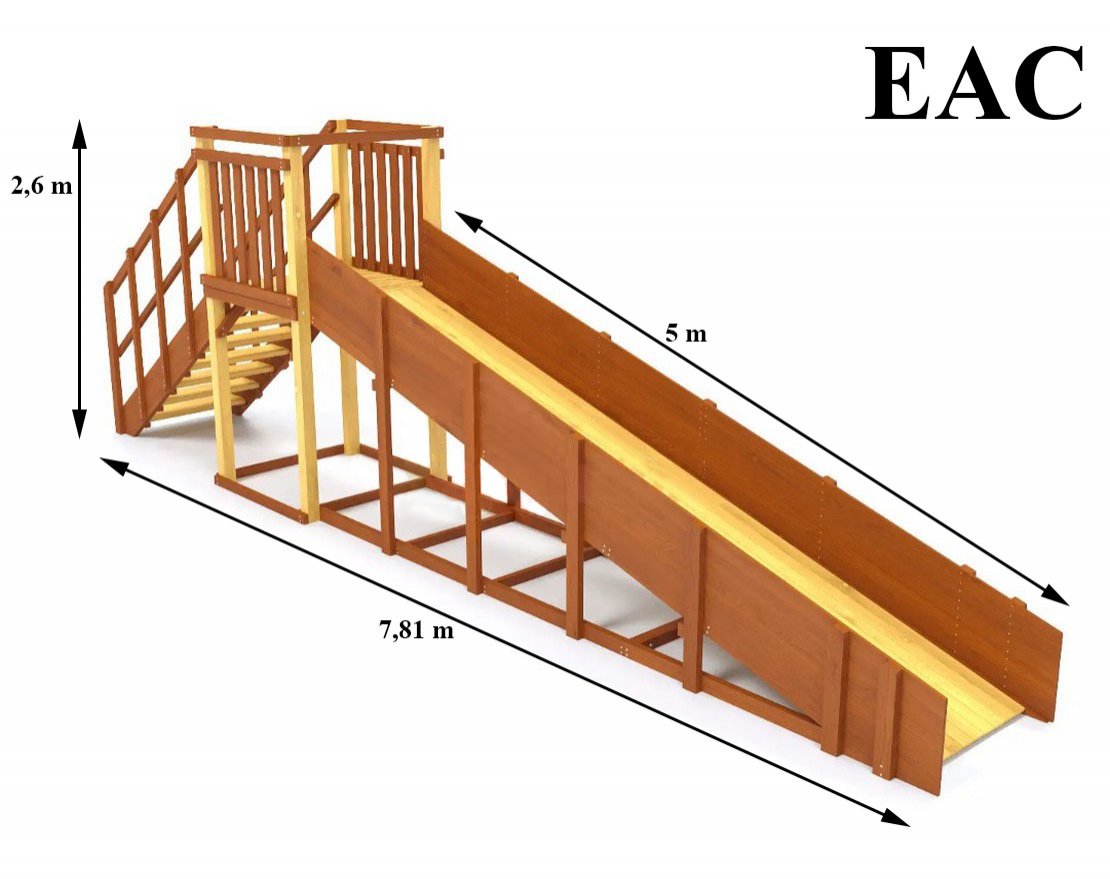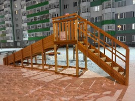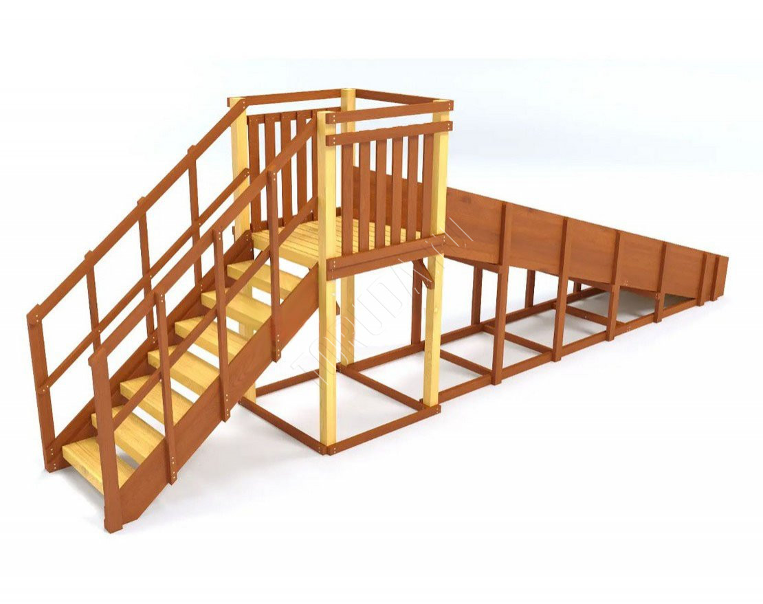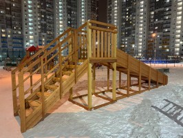Каркас зимней горки сделан из прочного клееного бруса. Он может эксплуатироваться в любую погоду и служить при этом в течение долгих лет, сохраняя форму. От осадков материал защищен лакокрасочным покрытием на натуральной основе. Все элементы модели сертифицированы и соответствуют ГОСТ (Декларация ТР ЕАЭС 038).
