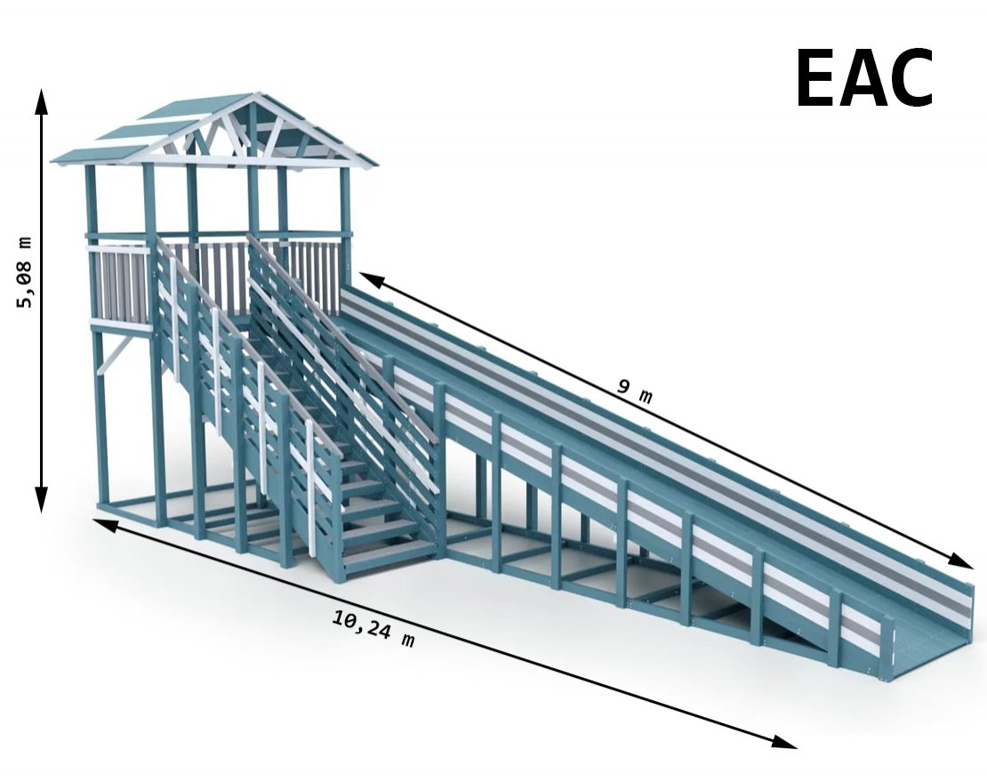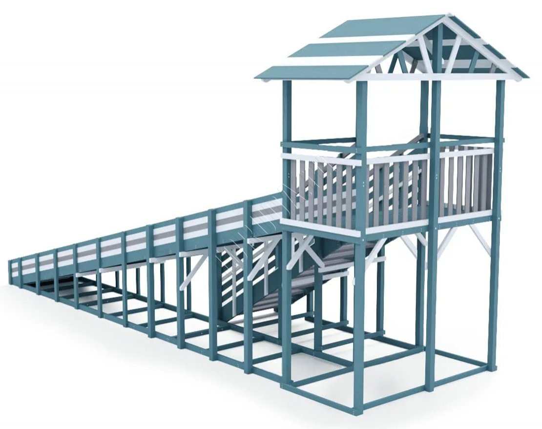 Конструкция надёжна и устойчива, выполнена из клееного бруса сечением 90×90 мм. Все поверхности тщательно шлифуются, углы скруглены, а бортики и прочные перила обеспечивают максимальную безопасность.