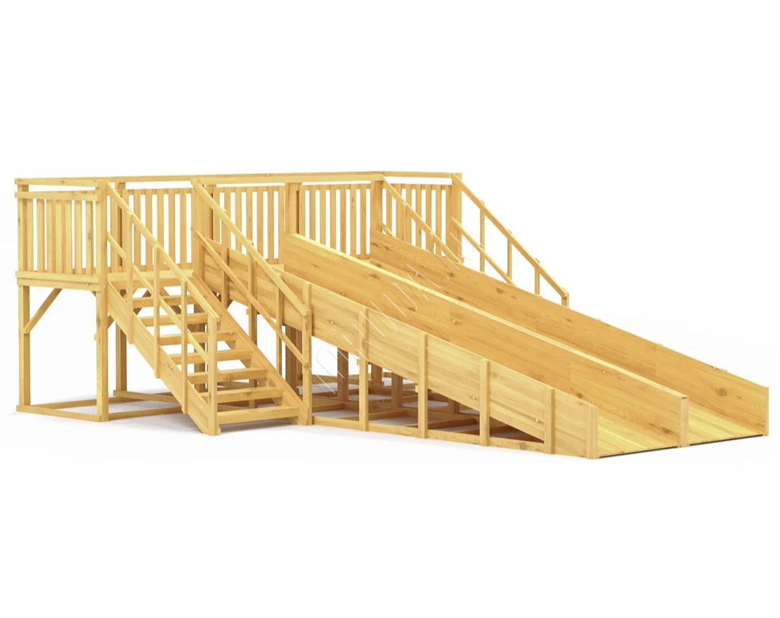Зимняя горка с двумя длинными скатами по 6 метров, на которых дети смогут кататься без остановки. Конструкция выполнена из прочного клееного бруса