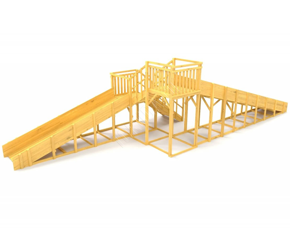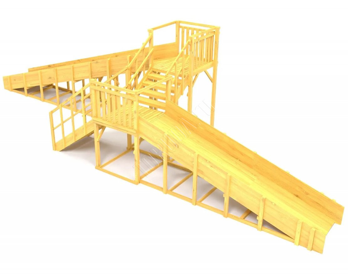 Все элементы выполнены из прочного клеёного бруса камерной сушки. Поверхности отшлифованы, углы скруглены, а крепежи закрыты заглушками. Горка долговечна, устойчива к нагрузкам и полностью безопасна.