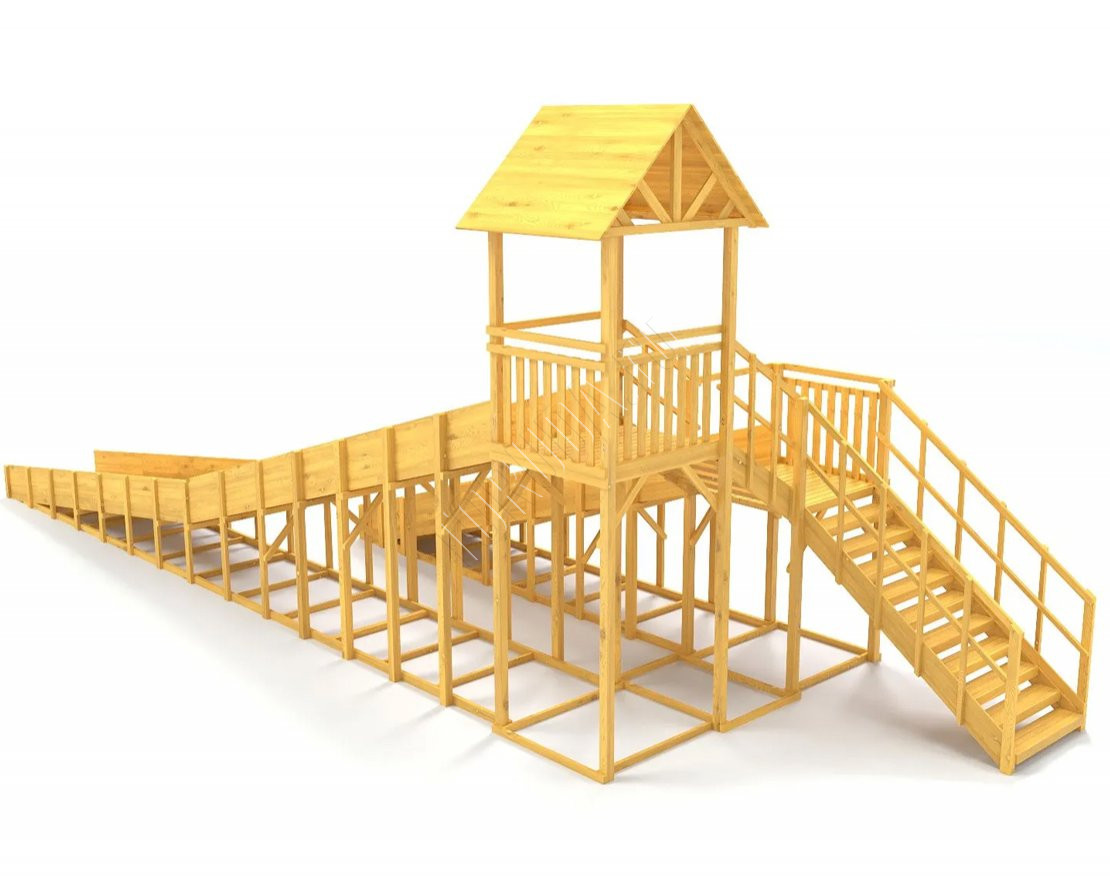 Каркас модели сделан из надежного клееного бруса, который отлично выдерживает любые погодные условия, сохраняя безупречную геометрию на протяжении многих лет. Поверхность дополнительно защищена от осадков экологичным лакокрасочным покрытием с разрешающим сертификатом, допускающим применение состава для детских комплексов.