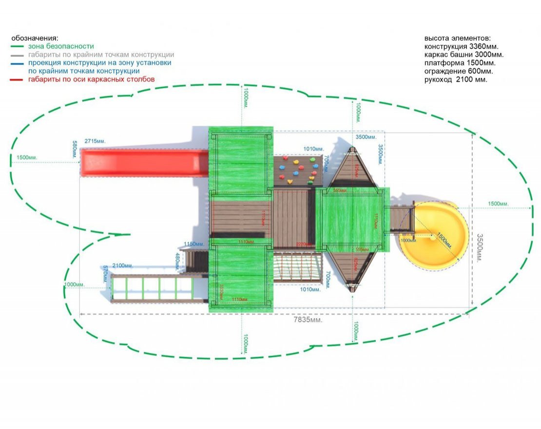 Для безопасной эксплуатации конструкции, площадка должна быть свободна от зеленых насаждений, сооружений и других конструкций, ровная, без перепадов уровня, без впадин и насыпей. Габариты площадки с учетом зоны безопасности длина 10835мм. ширина 6500мм., площадь площадки S-70,4м². Запрещено устанавливать конструкцию в зонах с повышенным риском провалов в грунте (болотистая местность, береговая линия водоемов, в непосредственной близости с оврагами и обрывами).
