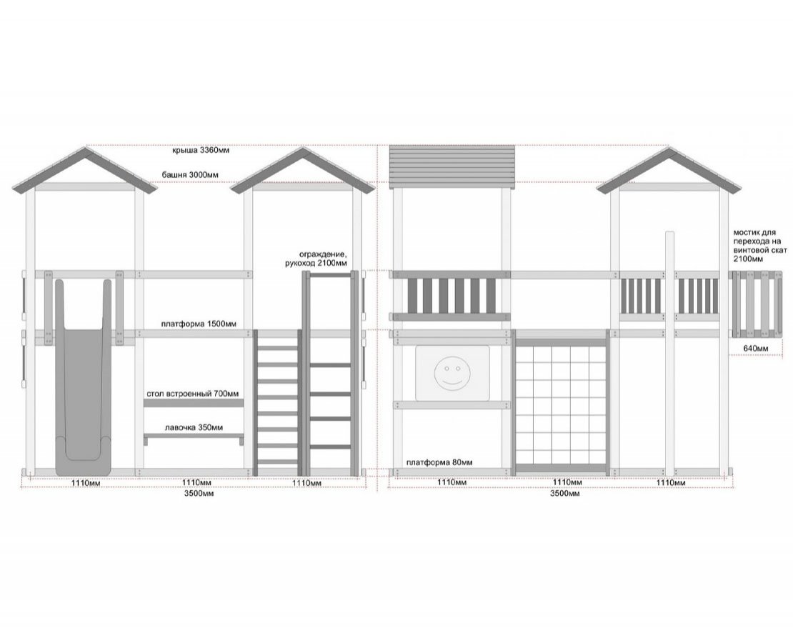 Основа детской игровой - спортивной конструкции – три башни с мостами и балконами «серия Н». Конструкция оснащена тремя двухскатными деревянными крышами, встроенным полом, встроенным столиком с лавками в нижней части конструкции, пластиковым антивандальным скатом с превосходной скользящей поверхностью, антивандальным винтовым скатом с переходным мостиком, «П»-образным деревянным рукоходом, скалодромом, канатной лестницей с армированным канатом, деревянной лестницей, антивандальными пластиковыми игровыми панелями и антивандальными штурвалами. Для безопасности ребенка предусмотрены перила на лестнице, заборчики и ограждения над зонами препятствий (скат).
