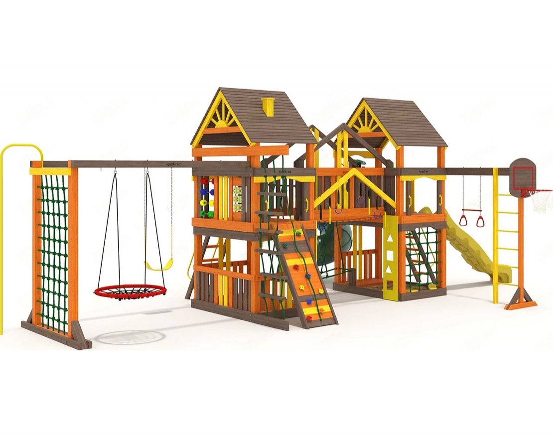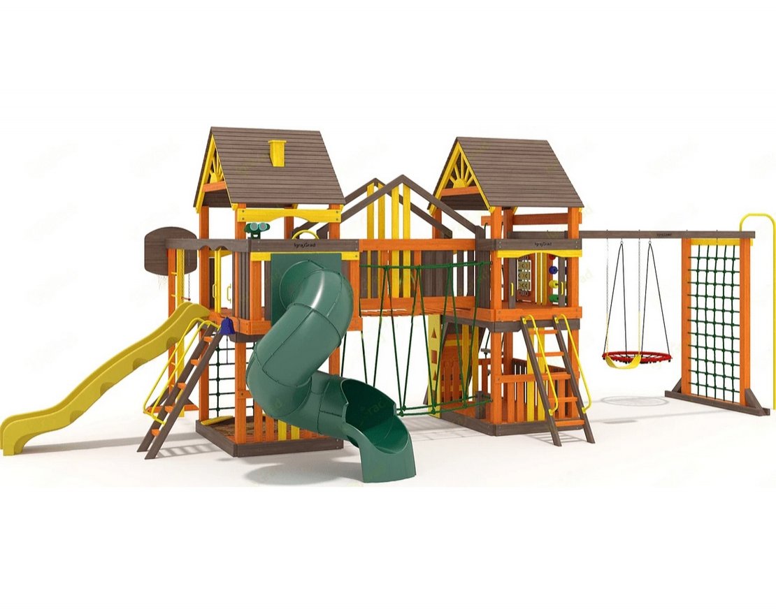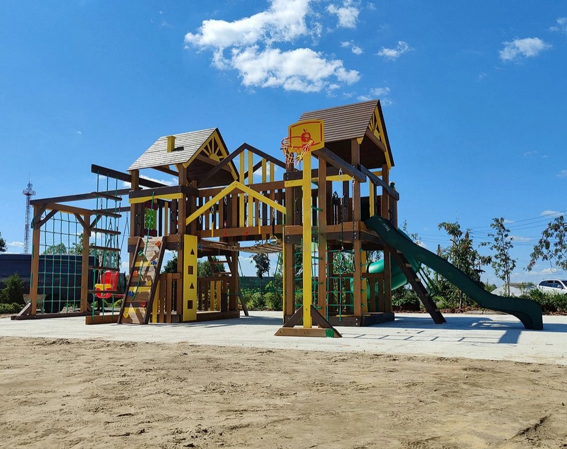 Для весёлого времяпрепровождения предусмотрено наличие волнообразной, винтообразной горок, качелей, панели для игры в «Крестики-нолики», песочницы.