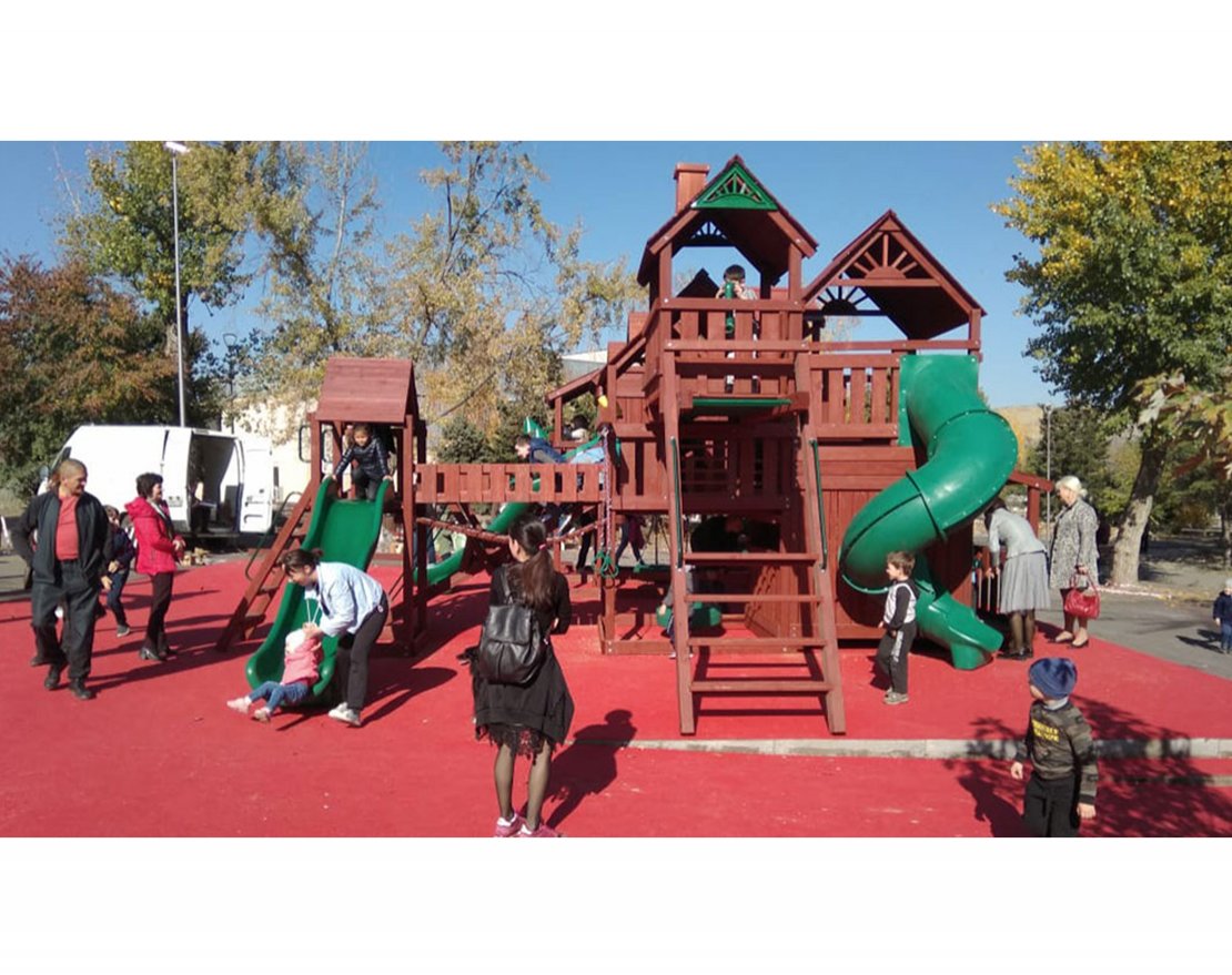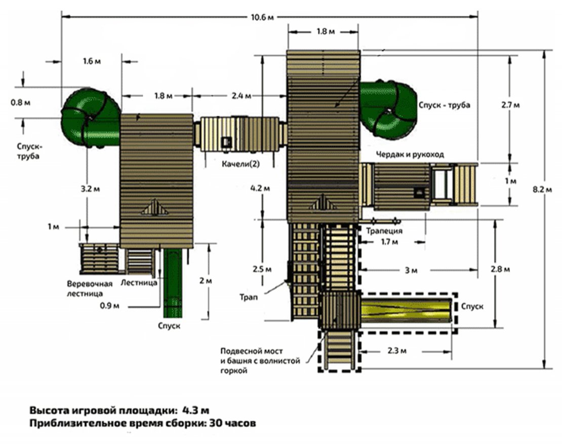 В комплектацию входит: семь различных игровых площадок на разных уровнях общей площадью более 19 м2, два встроенных домика с окошками, крыльцом и дверьми, четыре суперпрочные горки различной конструкции, три песочницы и многое другое. Эксклюзивная конструкция мостика соединяет площадки верхнего уровня, а с верхней галереи открывается неповторимый вид.