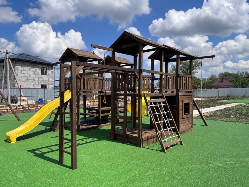 Основа детской игровой - спортивной конструкции – четыре башни с игровой платформой соединены мостиками и качельной балкой. Конструкция оснащена двускатными деревянными крышами, встроенным домиком, встроенным столиком с лавками, встроенной песочницей и дополнительной платформой в нижней части конструкции, пластиковыми волнообразным скатом и винтовым скатом с превосходной скользящей поверхностью, деревянной лестницей, широким скалодромом, канатной лестницей, деревянным рукоходом, шведской стенкой, сидением качели «гнездо», гимнастическим канатом, гимнастическими кольцами и подвесной лестницей. Для безопасности ребенка предусмотрены перила на лестнице, заборчики и ограждения над зонами препятствий (скалодром, канатная лестница, скат).