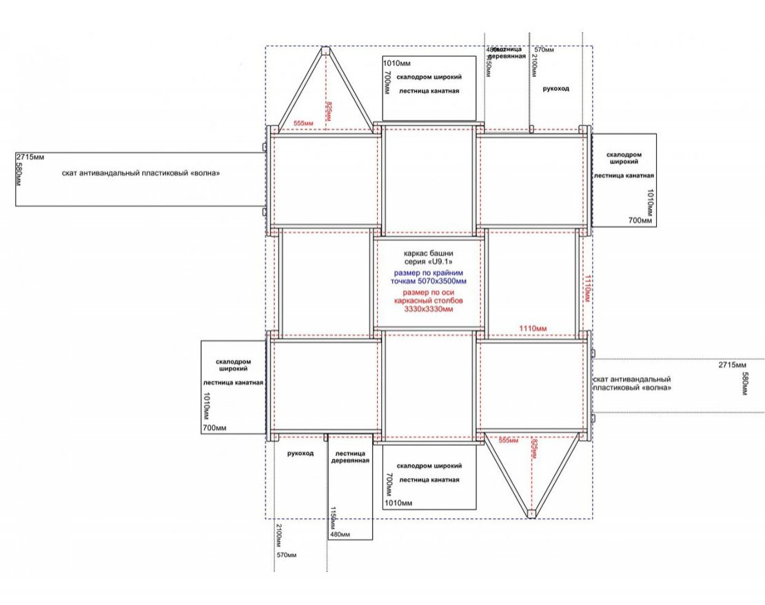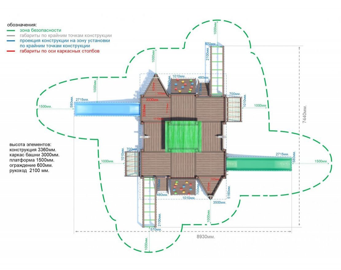 Для безопасной эксплуатации конструкции, площадка должна быть свободна от зеленых насаждений, сооружений и других конструкций, ровная, без перепадов уровня, без впадин и насыпей. Габариты площадки с учетом зоны безопасности длина 11930мм. ширина 10640мм., площадь площадки S-127м². Запрещено устанавливать конструкцию в зонах с повышенным риском провалов в грунте (болотистая местность, береговая линия водоемов, в непосредственной близости с оврагами и обрывами).