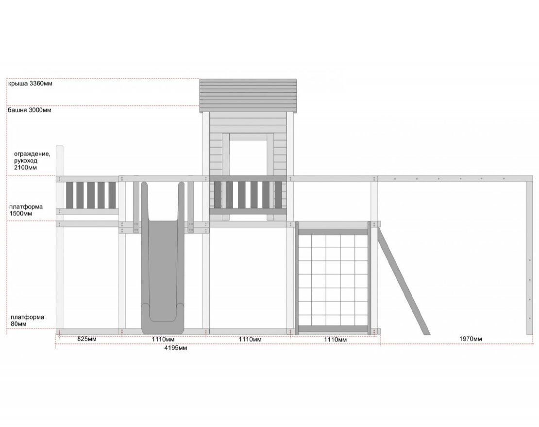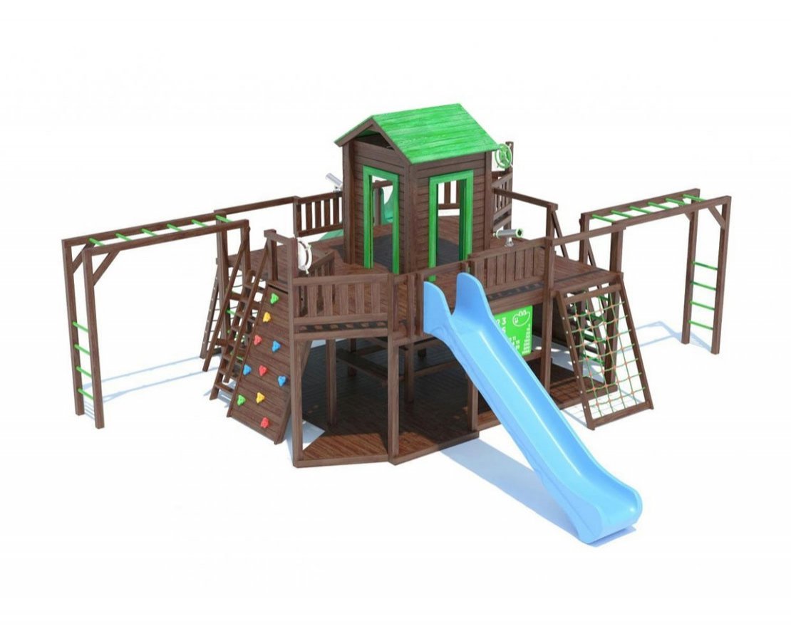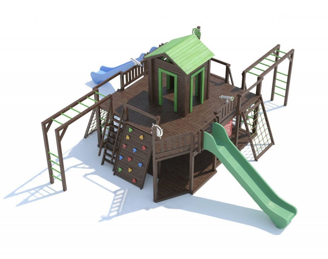 Основа детской игровой - спортивной конструкции – башня с платформой «серия К». Конструкция оснащена двухскатной деревянной крышей, встроенным полом, встроенным домиком в верхней части конструкции, встроенным столиком с лавками в нижней части конструкции, двумя пластиковыми антивандальными скатами с превосходной скользящей поверхностью, двумя «П»-образными деревянными рукоходами, двумя скалодромами, двумя канатными лестницами с армированным канатом, двумя деревянными лестницами, антивандальными пластиковыми игровыми панелями, штурвалами и телескопами. Для безопасности ребенка предусмотрены перила на лестнице, заборчики и ограждения над зонами препятствий (скат).