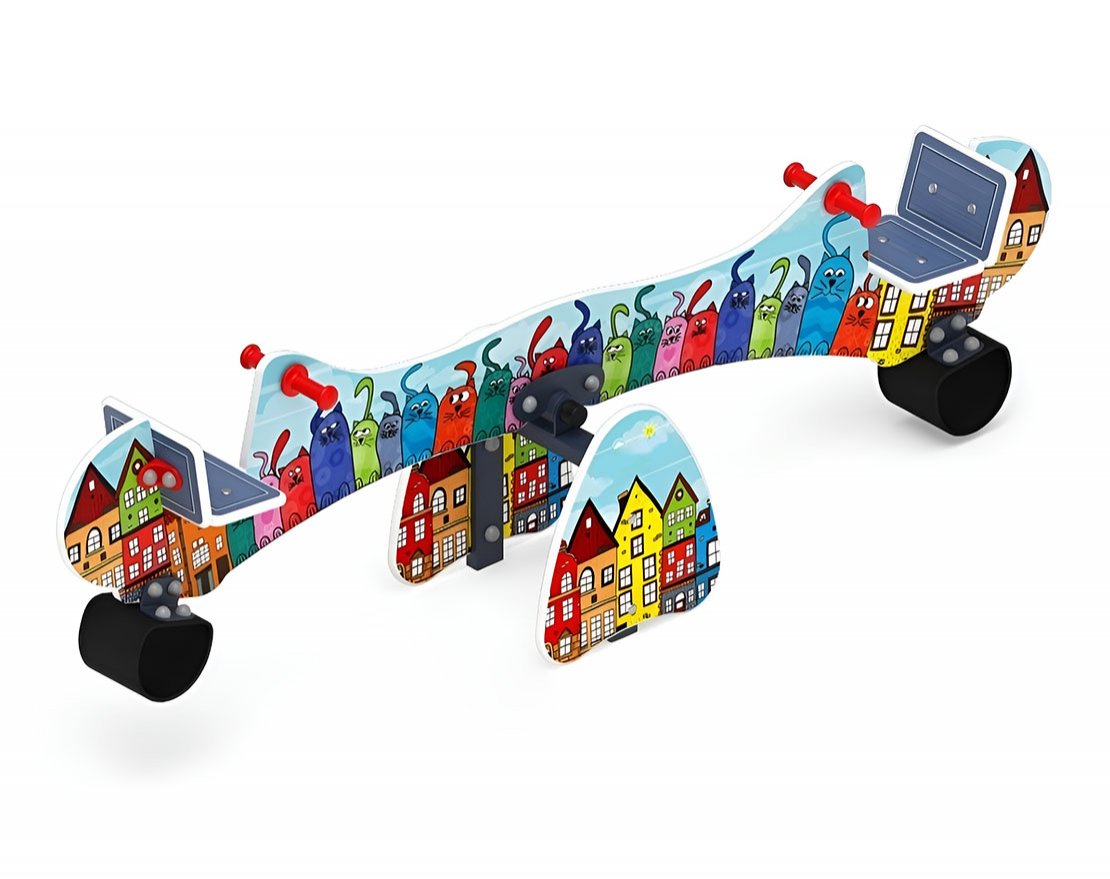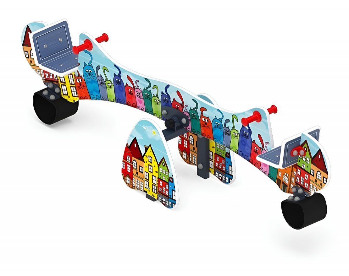 Сварная конструкция выполнена из стальной трубы прямоугольной 60х30х3 мм, трубы прямоугольной 50х25х2 мм и трубы наружным диаметром 27 мм, а также скобы, втулки и двух подшипников, окрашен порошковой краской в графитово - серый цвет. Каркас с двух сторон закрыт декоративными щитами из влагостойкой фанеры толщиной не менее 18 мм. Щиты окрашены с нанесением принта - "Коты". Размер каркаса опоры: 735х370х300 мм (до бетонирования).