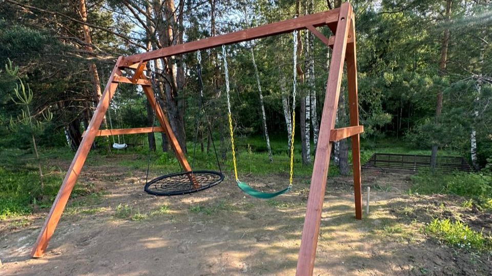 Игровые качели с легкостью устанавливаются на любой свободной от насаждений ровной территории.