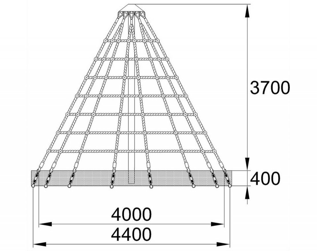 Канатная конструкция для детской игровой/спортивной площадки. Диаметр изделия — 4000 мм, высота — 3700 мм. Изготовлена из полипропиленового каната, армированного стальной проволокой. Канат соединяется между собой литыми крестообразными соединителями, изготовленными из полиамида. Концы каната обжимаются алюминиевыми втулками и фиксируются с помощью стальных оцинкованных коушей. Пирамида комплектуется натяжителями — талрепами и металлическим навершием конусной формы. Монтаж пирамиды осуществляется на металлическую трубу.