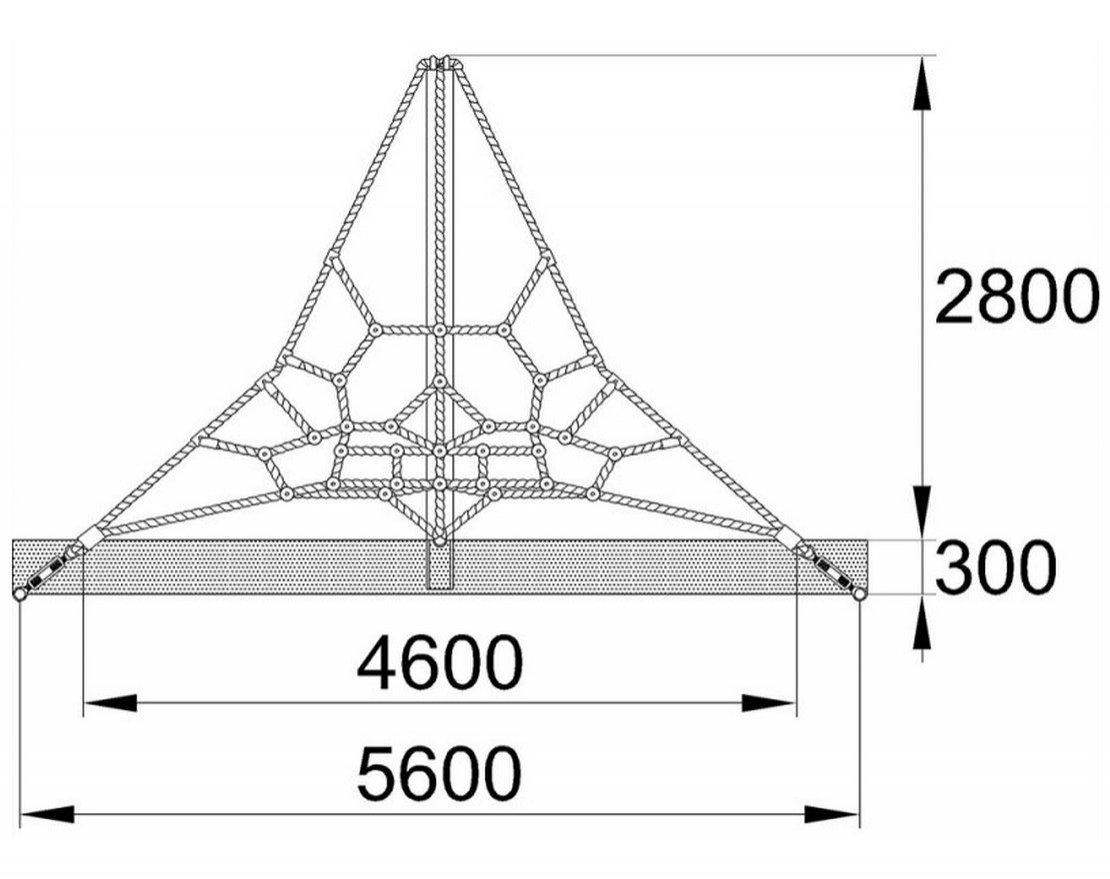 Канатная конструкция с габаритами 4600x4600x2800 мм. Предназначена для детских игровых и спортивных площадок. Изготовлена из армированного полипропиленового каната с крестообразными соединителями из полиамида. Концы каната фиксируются стальными оцинкованными коушами. В комплект входят металлические талрепы (для натяжения) и алюминиевое навершие под трубу диаметром 108 мм. Канатная конструкция может использоваться как в помещении, так и на открытых площадках.