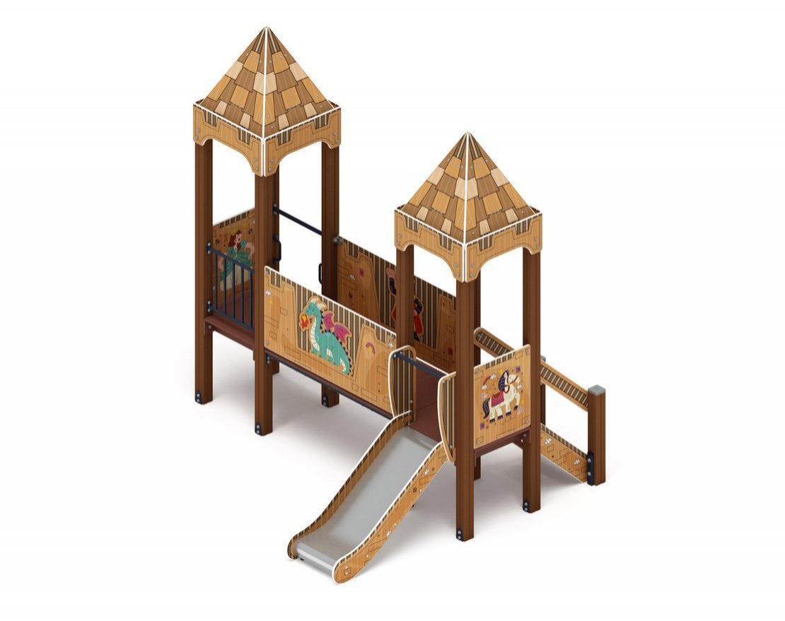 Выполнена из четырёх клеёных брусьев, окрашенных в коричневый цвет, сечением 100х100 мм и высотой 2500 мм. Пол из ламинированной фанеры с антискользящим покрытием размером 780х780 мм и толщиной 18 мм. Башня украшена стилизованными декоративными арками (780х330х18 мм) и четырехскатной крышей, крыша поставляется в сборе и выполнена из влагостойкой фанеры толщиной 12 мм (габариты в сборе 770х770х740 мм), кромки фанеры тщательно шлифованы, окрашены с нанесением принта. Отметка пола башни от планировочной отметки площадки 750 мм.