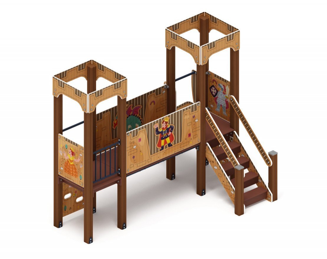 Выполнена из четырёх клеёных брусьев, окрашенных в коричневый цвет, сечением 100х100 мм и высотой 2500 мм. Пол из ламинированной фанеры с антискользящим покрытием размером 780х780 мм и толщиной 18 мм. Башня без крыши, украшена стилизованными декоративными арками, кромки фанеры тщательно шлифованы, окрашены с нанесением принта. Отметка пола башни от планировочной отметки площадки 900 мм.