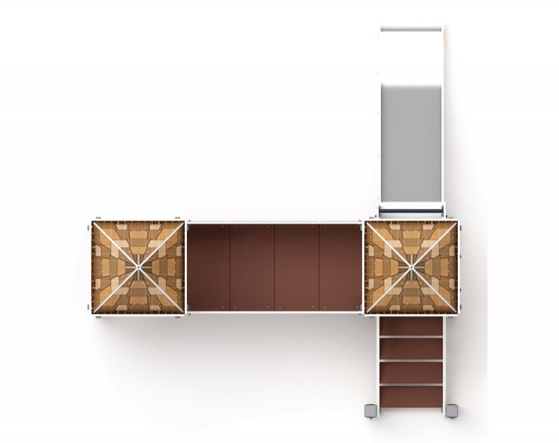 Лестница состоит из бортов, выполненных из фанеры влагостойкой толщиной 24 мм, и четырех ступенек, выполненных из ламинированной антискользящей фанеры, толщиной 18 мм, ширина ступней 560 мм. Пространство между ступенями закрыто экранами из влагостойкой фанеры толщиной 18 мм, между ступенью и экраном имеется щель для слива дождевой воды. Ступени и экраны вставляются в пазы бортов лестницы. Борта стягиваются шпильками диаметром 10 мм. Кромки фанеры тщательно шлифованы, борта окрашены при помощи УФ-печати. Лестница монтируется к брусу башни и на входе — к двум клеёным брусам 100х100 мм, высота 800 мм, брус окрашен в коричневый цвет. Лестница поставляется в собранном виде.
