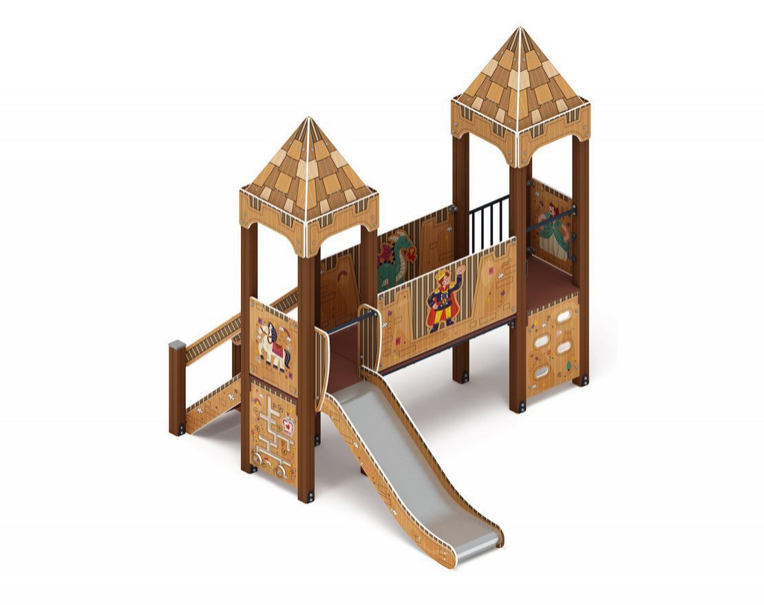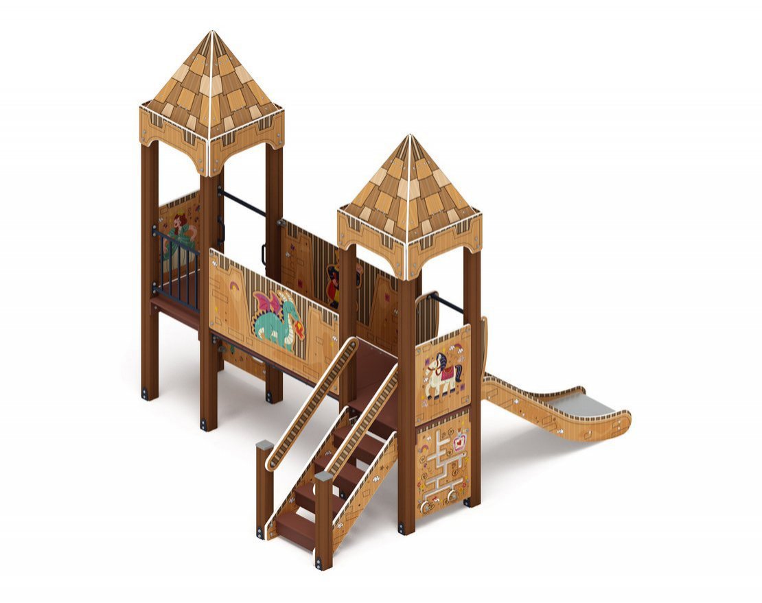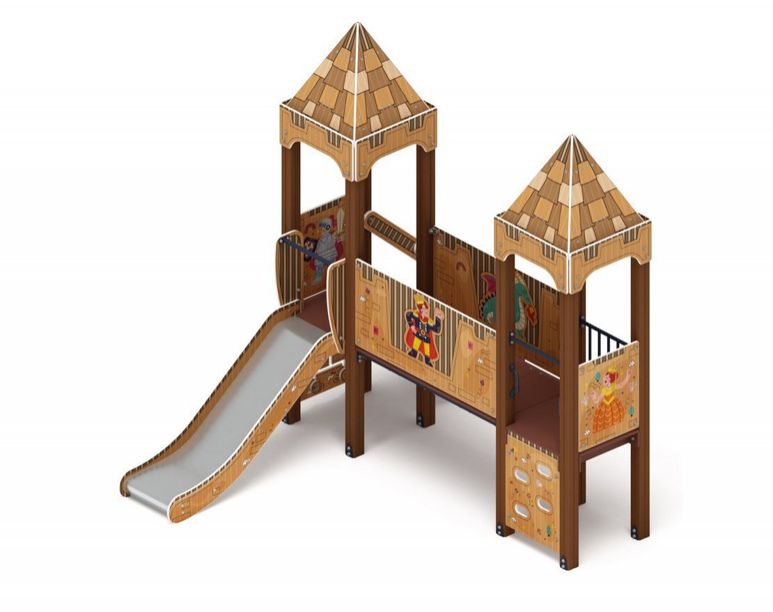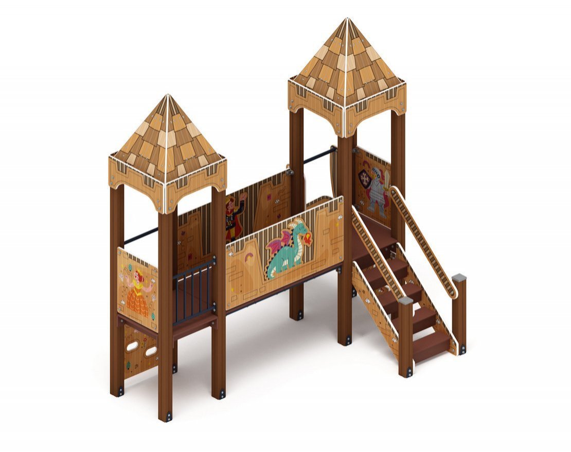 Выполнена из четырёх клеёных брусьев, окрашенных в коричневый цвет, сечением 100х100 мм и высотой 2500 мм. Пол из ламинированной фанеры с антискользящим покрытием размером 780х780 мм и толщиной 18 мм. Башня украшена стилизованными декоративными арками (780х330х18 мм) и четырехскатной крышей, крыша поставляется в сборе и выполнена из влагостойкой фанеры толщиной 12 мм (габариты в сборе 770х770х740 мм), кромки фанеры тщательно шлифованы, окрашены с нанесением принта. Отметка пола башни от планировочной отметки площадки 900 мм.