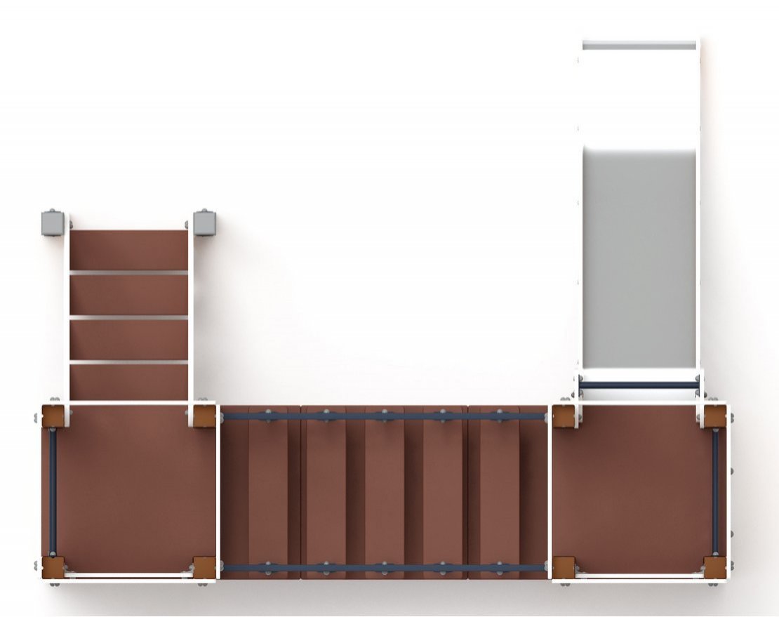 Состоит из половиц, выполненных из ламинированной антискользящей фанеры, размер 780х180х18 мм, в количестве 5 шт. Половицы скреплены между собой цепью и подвешены на деталях подвеса, изготовленных из профиля 20х20 мм и пластины 100х40х3, к ограждениям из металла. Ограждения - сварная конструкция из профиля 30х30х2 мм, трубы диаметром 22 мм, стальных пластин 40х60х4 мм. Ограждения и деталь подвеса покрыты порошковой краской. Под половицами имеется страховочный мост. Мост состоит из сварного каркаса из стальной профильной трубы 40х40х2 и трубы 40х25х2 мм, а также стальных пластин шириной 40 мм и длиной 120 мм и половиц из влагостойкой ламинированной фанеры (толщина 18 мм) с антискользящим покрытием 780х373х18 - 4 шт. Габариты моста в плане 1500х780 мм.