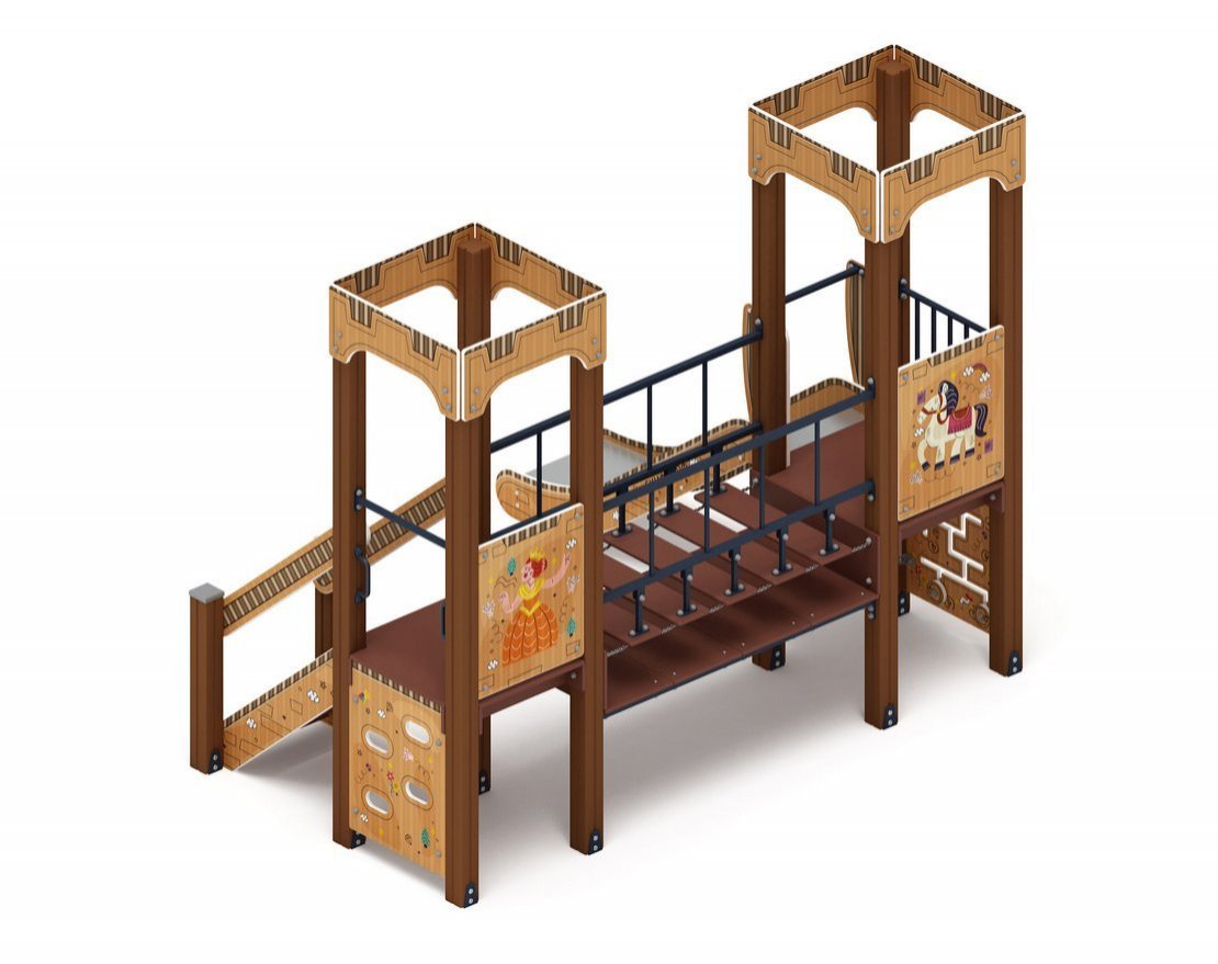 Выполнена из четырёх клеёных брусьев, окрашенных в коричневый цвет, сечением 100х100 мм и высотой 2500 мм. Пол из ламинированной фанеры с антискользящим покрытием размером 780х780 мм толщиной 18 мм. Башня без крыши, украшена стилизованными декоративными арками, кромки фанеры тщательно шлифованы, окрашены с нанесением принта. Отметка пола башни от планировочной отметки площадки 900 мм.