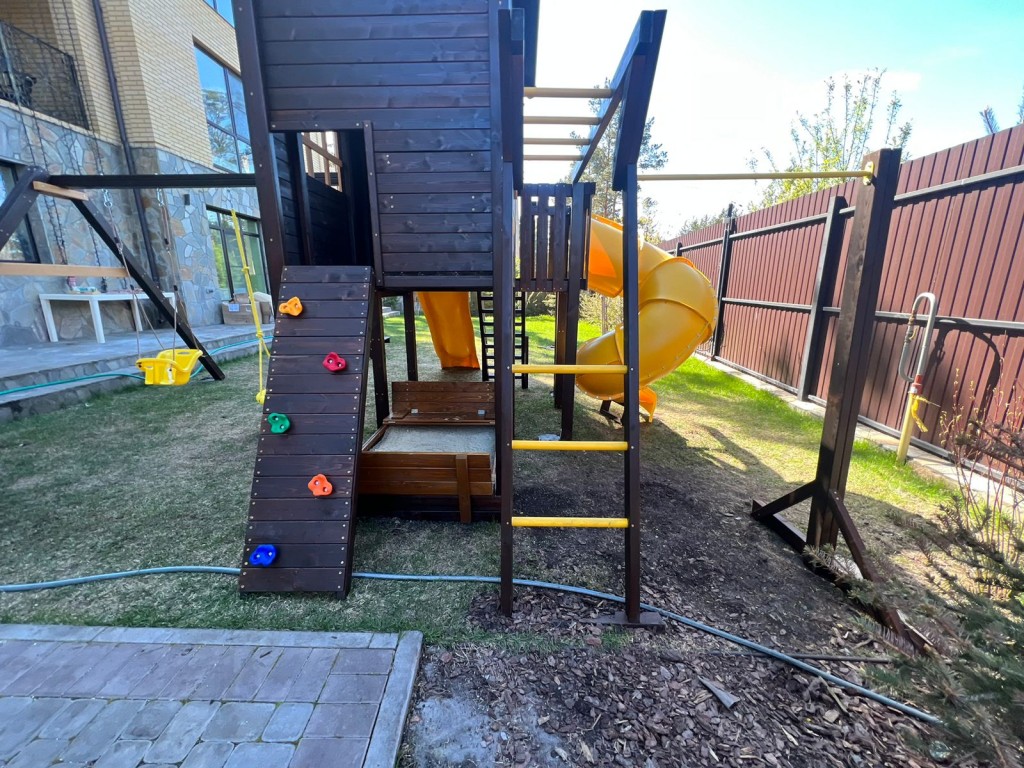 На втором этаже игровой площадки расположился большой просторный домик размером 126х145см. Данная премиальная модель обеспечивает разнообразные игровые модули, такие как турник, шведская стенка, горка «труба», гимнастические кольца, рукоход, задний лаз в домик и многое другое.