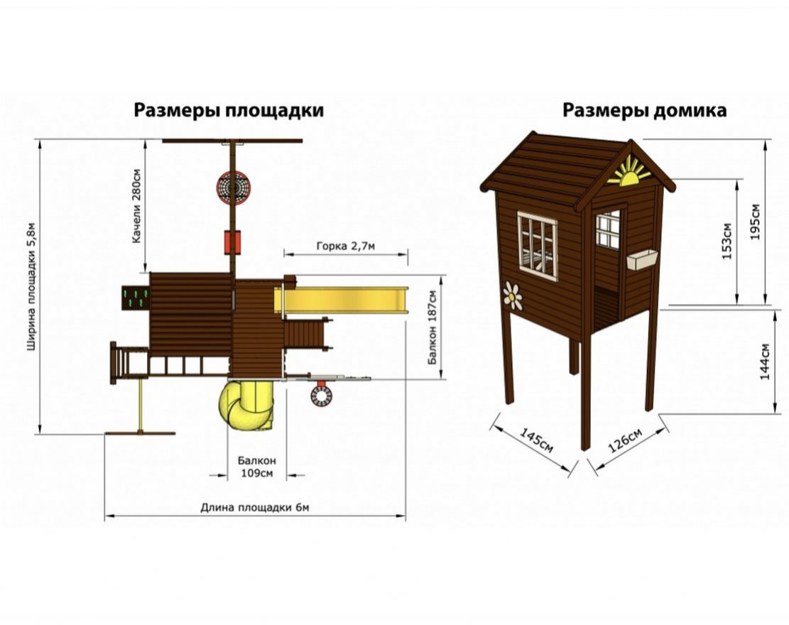 Отличительной особенностью игровых домиков серии Индиана является фирменный элемент "солнышко" на крыше, декоративные ромашки, а также наличие скворечника, возвышающегося над всей конструкцией.