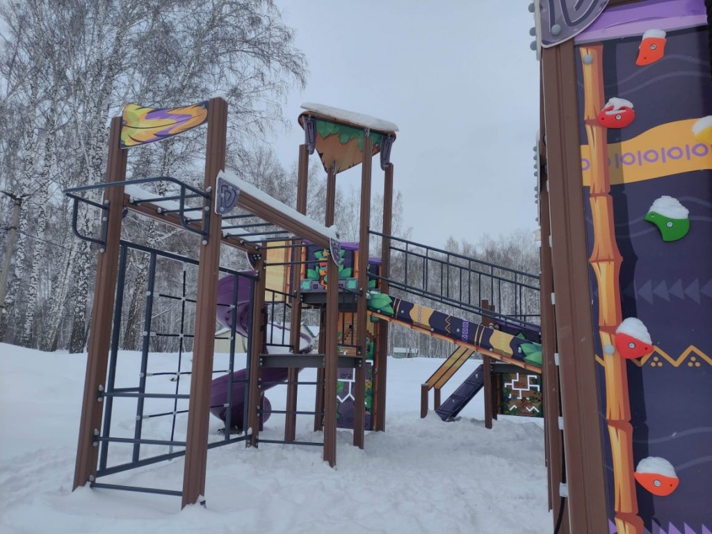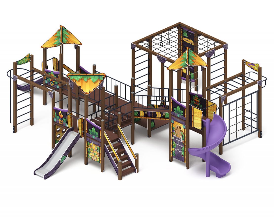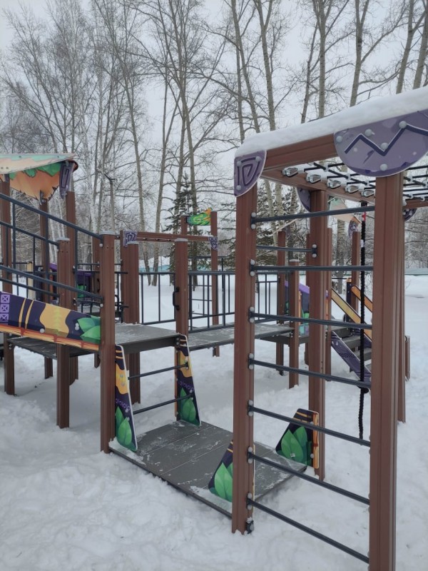 Спортивный комплекс состоит из двенадцати клеёных брусьев, окрашенных в коричневый цвет сечением 100х100 мм высотой 2500 мм. Восемь являются опорой , а четыре расположены в верхнем ярусе и объединяют комплекс в единую конструкцию, на комплексе имеются: шведские стенки, сетка для лазанья, тарзанка, канат, гимнастические кольца, скалолаз.