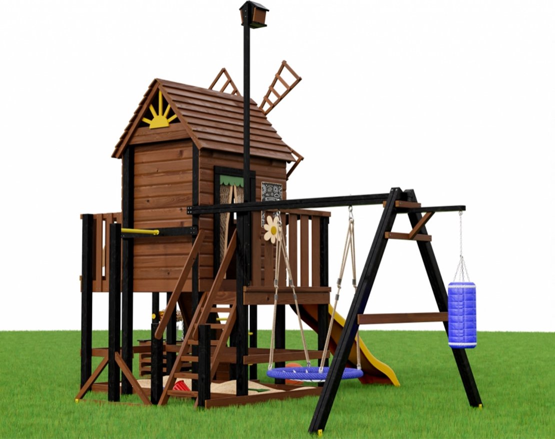 Игровой комплекс Мулен 1 с колодцем — это уютный деревянный домик, наполненный атмосферой приключений. Его узнаваемый силуэт с декоративными лопастями на крыше перенесет детей в мир сказок, где можно представить себя отважным путешественником, хозяином мельницы или капитаном воздушного корабля. Площадка сочетает различные игровые и спортивные элементы, помогая ребенку развивать ловкость, силу и координацию. Лестницы, канаты, качели и горка превращают игру в увлекательное приключение, в котором важно не только фантазировать, но и двигаться. Внутри домика продумано всё до мелочей — каждый уголок наполнен возможностями для игры, творчества и удобства. На втором этаже маленьких художников ждет доска для рисования, где можно воплощать свои фантазии. Два отдельных столика со стульчиками позволяют детям играть, рисовать или устраивать чаепитие, не мешая друг другу. А просторная песочница под домиком станет местом для совместных экспериментов с песочными замками — здесь хватит места всем! Два раздельных входа делают пространство более просторным и удобным, создавая еще больше возможностей для веселой и динамичной игры.