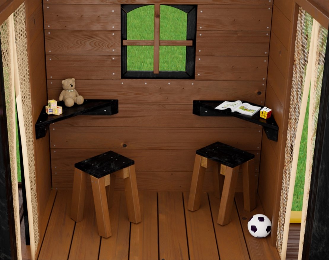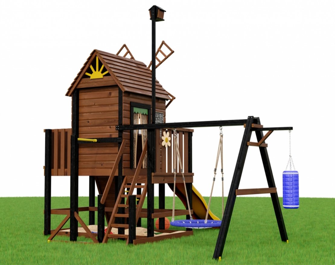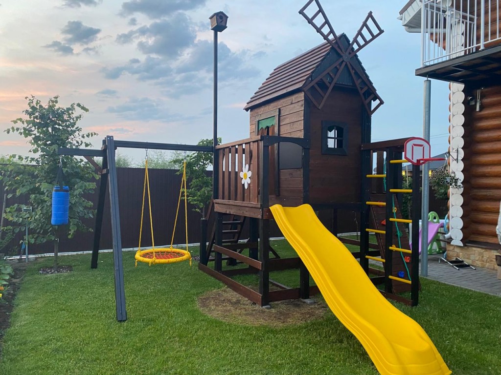 Игровой комплекс Мулен 1 — это уютный деревянный домик, наполненный атмосферой приключений. Его узнаваемый силуэт с декоративными лопастями на крыше перенесет детей в мир сказок, где можно представить себя отважным путешественником, хозяином мельницы или капитаном воздушного корабля. Площадка сочетает различные игровые и спортивные элементы, помогая ребенку развивать ловкость, силу и координацию. Лестницы, канаты, качели и горка превращают игру в увлекательное приключение, в котором важно не только фантазировать, но и двигаться. Внутри домика продумано всё до мелочей — каждый уголок наполнен возможностями для игры, творчества и удобства. На втором этаже маленьких художников ждет доска для рисования, где можно воплощать свои фантазии. Два отдельных столика со стульчиками позволяют детям играть, рисовать или устраивать чаепитие, не мешая друг другу. А просторная песочница под домиком станет местом для совместных экспериментов с песочными замками — здесь хватит места всем! Два раздельных входа делают пространство более просторным и удобным, создавая еще больше возможностей для веселой и динамичной игры.