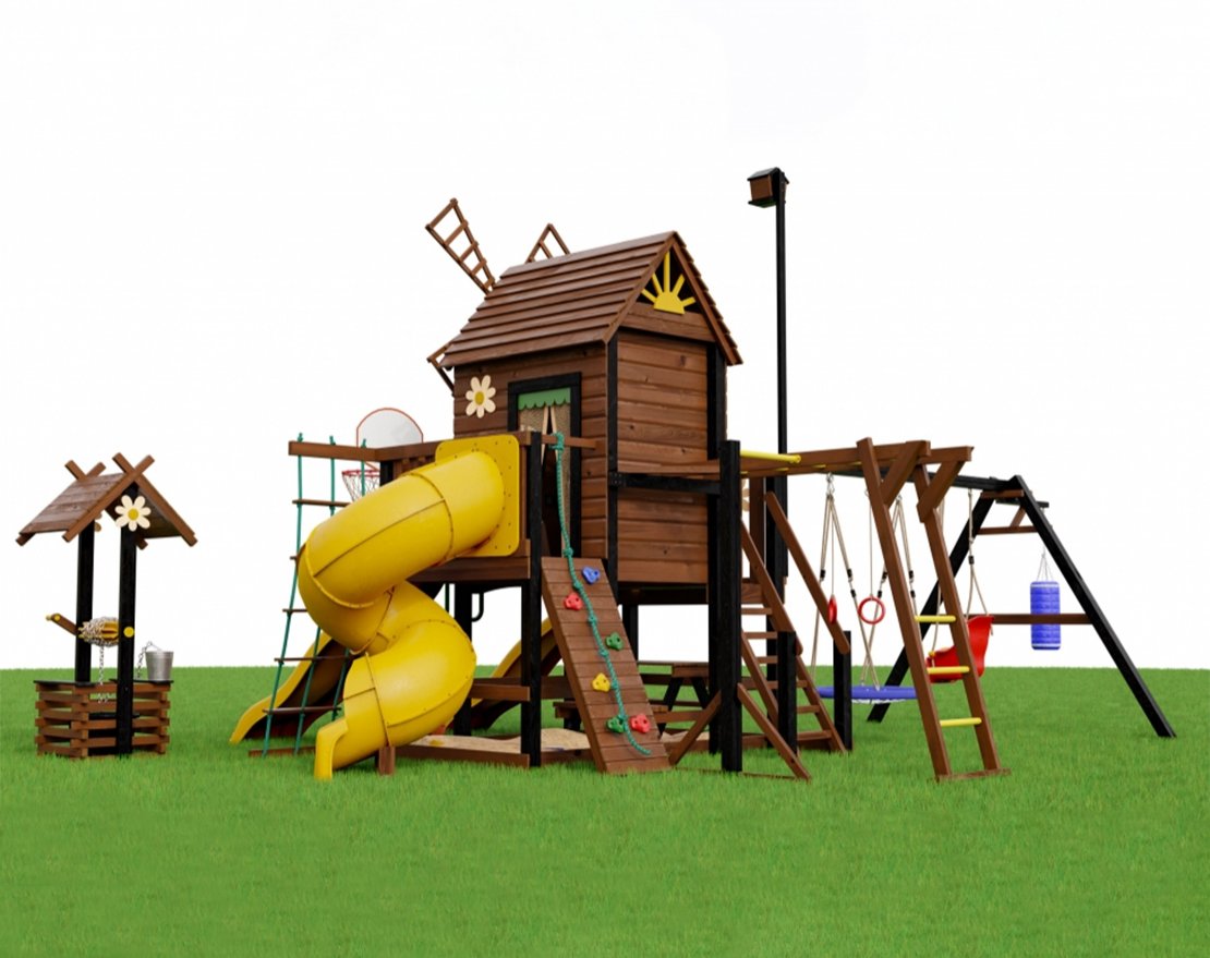 Игровой комплекс Мулен 6 с колодцем — это уютный деревянный домик, наполненный атмосферой приключений. Его узнаваемый силуэт с декоративными лопастями на крыше перенесет детей в мир сказок, где можно представить себя отважным путешественником, хозяином мельницы или капитаном воздушного корабля. Площадка сочетает различные игровые и спортивные элементы, помогая ребенку развивать ловкость, силу и координацию. Лестницы, канаты, качели и горка превращают игру в увлекательное приключение, в котором важно не только фантазировать, но и двигаться. Внутри домика продумано всё до мелочей — каждый уголок наполнен возможностями для игры, творчества и удобства. На втором этаже маленьких художников ждет доска для рисования, где можно воплощать свои фантазии. Два отдельных столика со стульчиками позволяют детям играть, рисовать или устраивать чаепитие, не мешая друг другу. А просторная песочница под домиком станет местом для совместных экспериментов с песочными замками — здесь хватит места всем! Два раздельных входа делают пространство более просторным и удобным, создавая еще больше возможностей для веселой и динамичной игры.