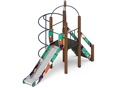 Скат горки шириной 530 мм, выполнен из нержавеющей стали t 1,5 мм, - цельного листа, борта выполнены из влагостойкой фанеры толщиной 24 мм, кромки фанеры тщательно шлифованы, борта окрашены при помощи УФ печати, принт –в стиле «Геометрия»- основной цвет принта – бирюзовый, на нем расположены геометрические фигуры, различных цветов- белого, красного, фиолетового, зеленого, голубого, желтого цвета. Ограждения стартового участка горки, выполнены из влагостойкой фанеры толщиной 18 мм. Опорный каркас горки выполнен из профиля 40х25 и труб диаметром 32 мм (металл имеет плавные радиусы и тщательную обработку швов, покрыт порошковой краской). Размер горки в плане 530х 2270х1200(h).