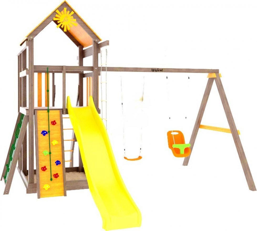 В данной модели собраны элементы для активны игр на свежем воздухе. Волновая горка, навесная лестница, сетка, по которой можно взобраться на второй уровень, турники и качели – ваш ребёнок будет в восторге и обязательно захочет пригласить друзей для ещё большего веселья.